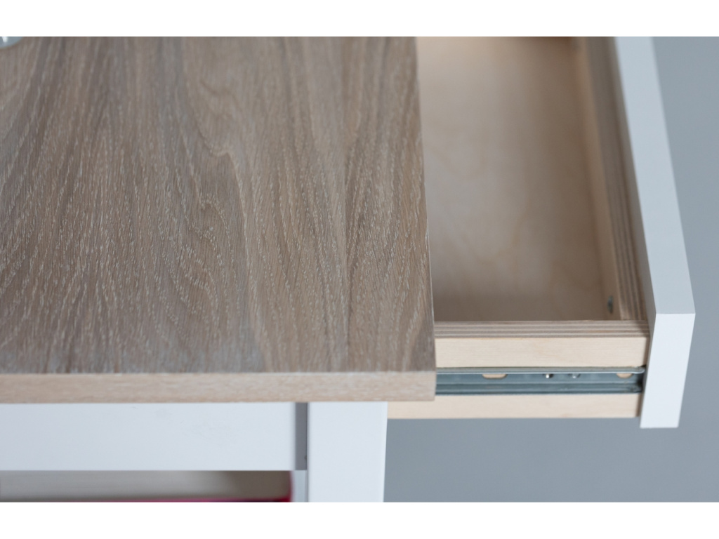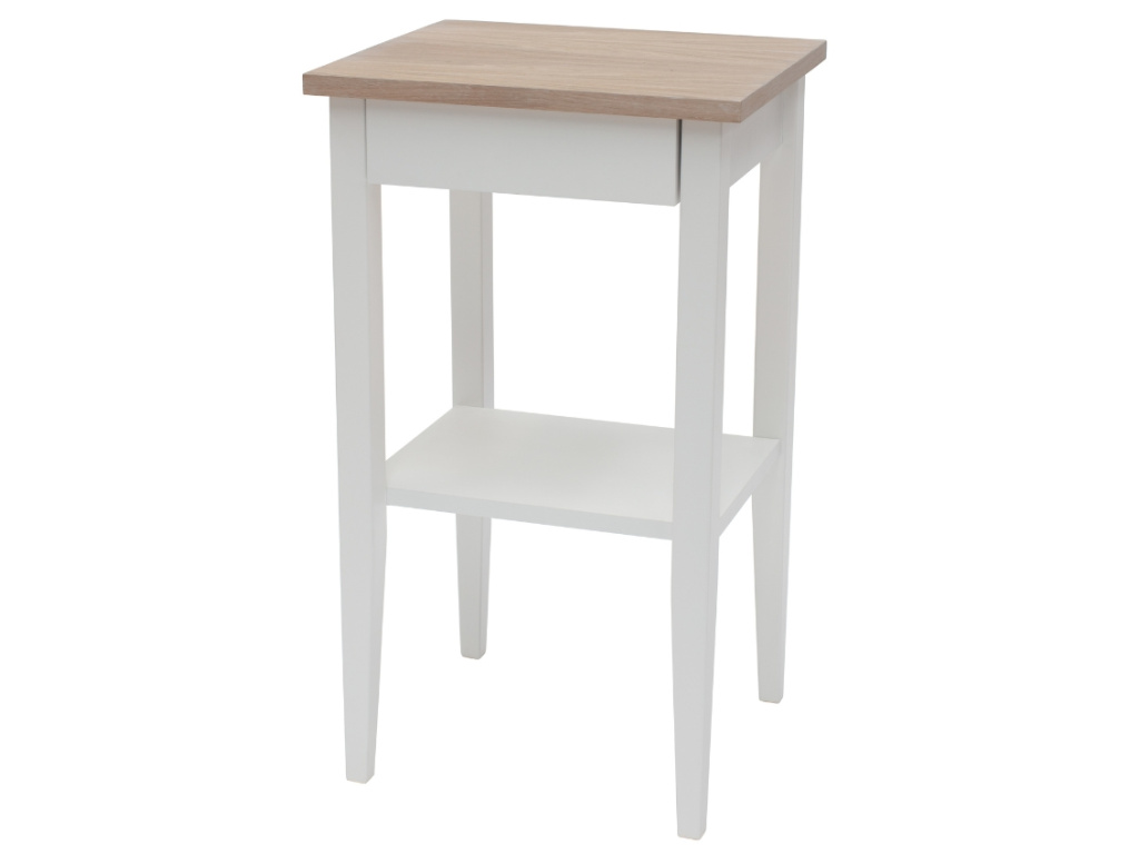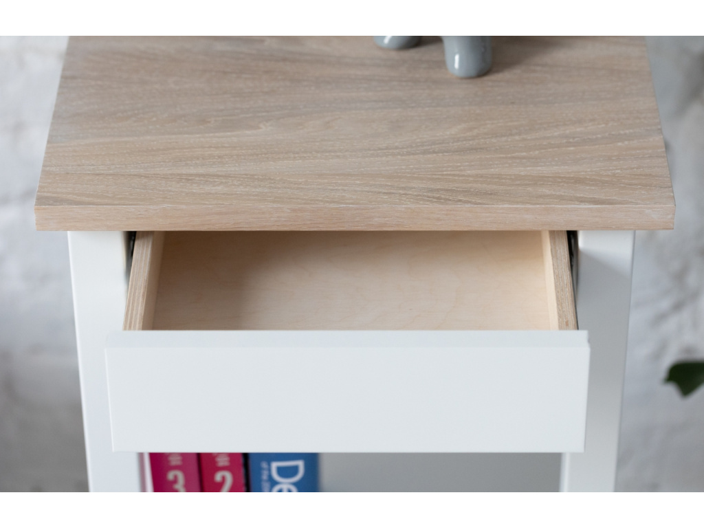 RAGABA ENTLIK je praktickým stolkem do domácnosti v čistém jednoduchém designu. Deska stolku je vyrobena z dubové dýhy a doplňuje ji vysoká podnož z bukového masivu. Výhodou stolku je nenápadná zásuvka, která však poskytne dostatečné úložiště na vaše drobnosti. Zásuvka je opatřena tlumičem, proto se nemusíte bát případných nárazů nebo brzkého opotřebení. Praktickým prvkem je také police, kam můžete umístit oblíbené knihy či dekorace a květiny. Stolek bude skvělým doplňkem do obývacího pokoje i jako noční stolek do ložnice.