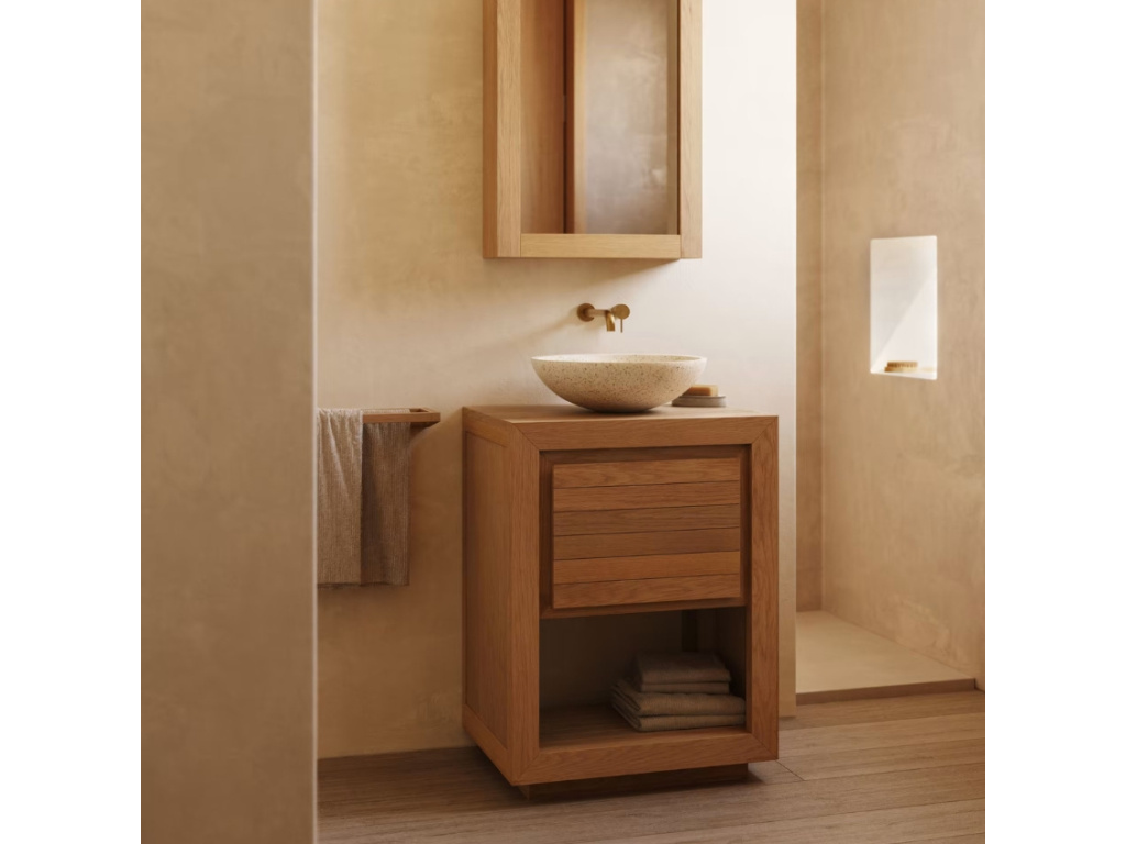 Umyvadlová skříňka Kenta pochází ze série koupelnového nábytku španělské značky Kave Home. Najdete v ní umyvadlové skříňky různých velikostí, zrcadlové skříňky i stojan na ručníky – vaše koupelna tak může být dokonale sladěná. Použité teakové dřevo ji navíc dokonale zútulní a dodá jí rustikální nádech. Skříňka disponuje jednou uzavřenou a jednou otevřenou policí, které můžete využít na čistící a prací prostředky i na léky nebo kosmetiku. Samozřejmostí je odolnost nábytku vůči vlhkosti a velké plus představuje certifikace FLEGT, díky které víte, že při výrobě produktu bylo myšleno na životní prostředí!