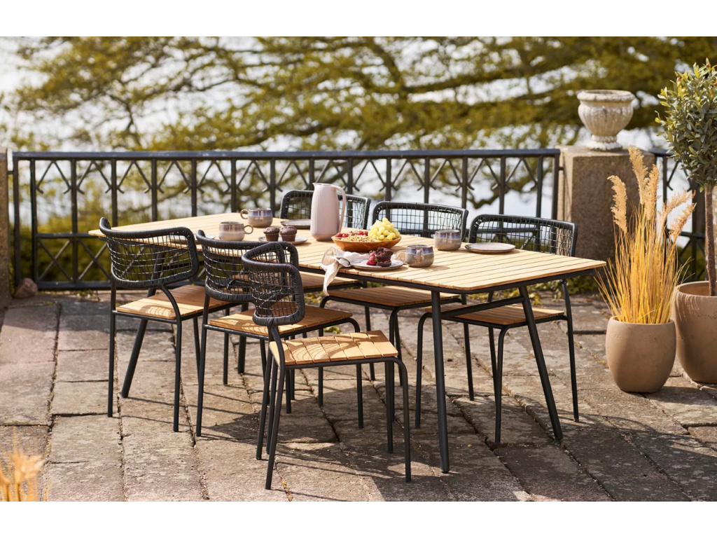 Zahradní židle Neshla představuje vše, co od zahradního nábytku čekáte i potřebujete. Klasický design v moderním zpracování padne díky použitým materiálům do všech zahrad i teras. Odolné materiály jako jsou kov a teakové dřevo odolají povětrnostním vlivům bez větších obtíží, a navíc se snadno udržují. Židle bude vypadat skvěle na terase i pod pergolou, použít ji ale můžete také v přírodně laděném interiéru.