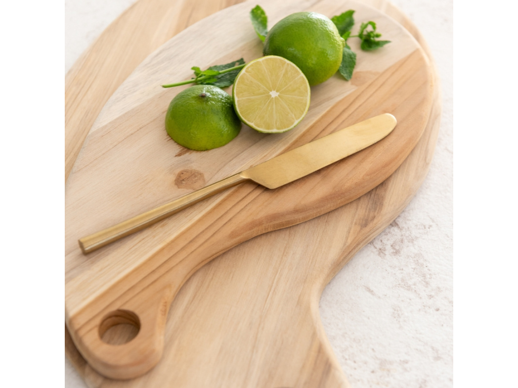 Moderní servírovací prkénko Flinn od značky J-Line se stane nejen přírodním, ale také stylovým prvkem u vás v kuchyni nebo v jídelně. Využijete ho jako praktického pomocníka při krájení surovin a zároveň bude také skvěle vypadat při podávání drobného občerstvení. Díky svému materiálu z teakového dřeva se bude hodit do skandinávských, venkovských nebo rustikálních interiérů. Můžete jej doplnit o prkénko v jiné velikosti ze stejné série a vytvořit si tak celý set.