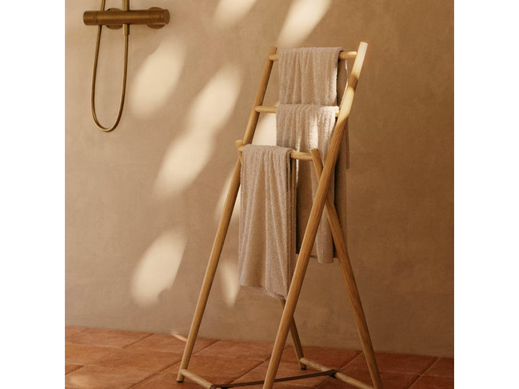 Věšák na ručníky Kenta pochází ze série koupelnového nábytku španělské značky Kave Home. Najdete v ní umyvadlové skříňky různých velikostí, zrcadlové skříňky i stojan na ručníky – vaše koupelna tak může být dokonale sladěná. Použité teakové dřevo ji navíc dokonale zútulní a dodá jí rustikální nádech. Na věšák se pohodlně vejdou až tři ručníky nebo osušky. A když ho zrovna nebudete potřebovat? Můžete ho snadno složit a odložit třeba za skříň! Samozřejmostí je odolnost nábytku vůči vlhkosti a velké plus představuje certifikace FLEGT, díky které víte, že při výrobě produktu bylo myšleno na životní prostředí!