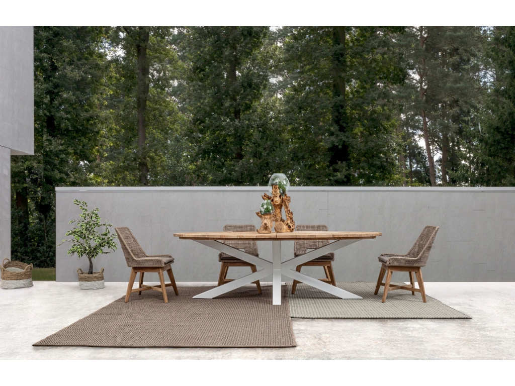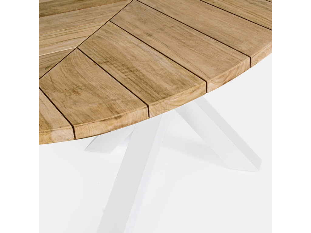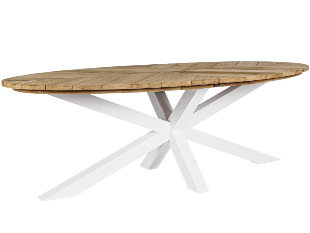 Elegantní oválný zahradní jídelní stůl Bizzotto Paldail si zamilujete na první pohled. Stůl vás uchvátí díky desce poskládané z masivního teakového dřeva v krásném přírodním odstínu. Deska stolu je doplněna bíle lakovanou hliníkovou podnoží, jejíž zajímavý design dodává stolu na originalitě a osobitosti. Stůl Paldail se skvěle hodí do komerčních i nekomerčních prostorů.