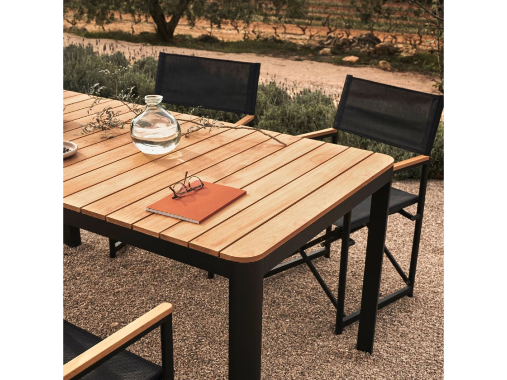 Zahradní jídelní stůl Kave Home Bona s hliníkovou podnoží má desku tvořenou teakovým dřevem. Zaujme svým elegantním designem a také atraktivním spojením černé a přírodní barvy. Slušet mu to bude s židlemi tmavších barev, nejvíce se k němu ale hodí hliníkové židle s podsedáky ze stejnojmenné série. Vybrat si můžete ze dvou dostupných velikostí podle toho, kolik prostoru máte a kolik přátel potřebujete pohostit.