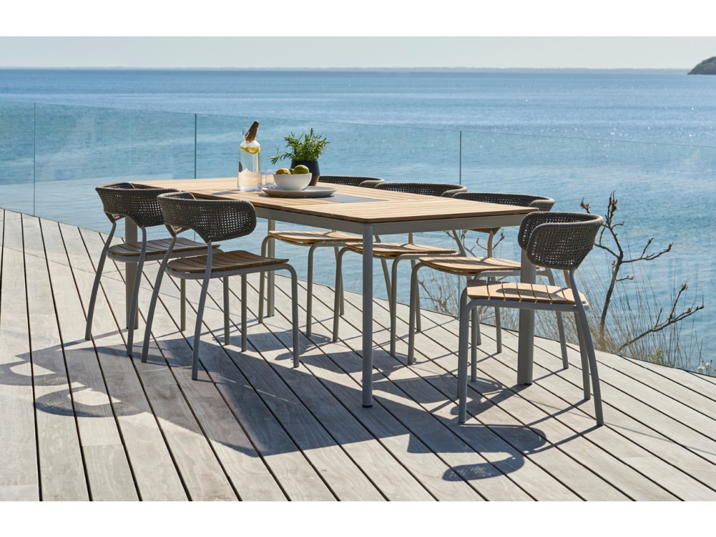 Zahradní stůl Mindo 101 je znám pro svou eleganci, styl a funkčnost. Teaková deska ve spojení s hliníkovou konstrukcí je odolnou a na údržbu nenáročnou kombinací. Rovné linie a čistý design zajistí příjemnou atmosféru při stolování s přáteli a rodinou. Celkový design kompletuje keramická deska uprostřed stolu. Řada Mindo 101 vznikla pod taktovkou designéra Thomase E. Alkena, který si pro vás připravil další designové kousky, jako jsou židle Mindo 101, které se stolem vytvoří stylový zahradní jídelní set.