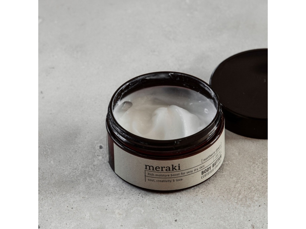Hedvábně jemné tělové máslo Northern Dawn od Meraki hluboce vyživí a bohatě hydratuje vaši suchou pokožku. Organické složky jako jsou Aloe vera, bambucké máslo, olivový, slunečnicový a mandlový olej spolu pokožce dodají potřebnou vlhkost, aniž by ji činily mastnou. Máslo vás okouzlí lehkým sladkým nádechem s tóny svěžího pomeranče, cedrového dřeva, a balsamica.