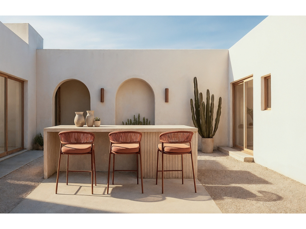 Barová židle Randall v terakotově červeném provedení zaujme svým odlehčeným designem a precizním zpracováním. Elegantní vyplétaná opěrka zajišťuje příjemné větrání i při horkých dnech. Stabilní ocelová konstrukce s úpravou pro venkovní použití doplňuje čalouněný sedák, ideální pro dlouhé posezení během letních večerů. Kolekce Randall přináší moderní a zároveň útulný výraz na městské terasy i do klidných zahradních zákoutí.