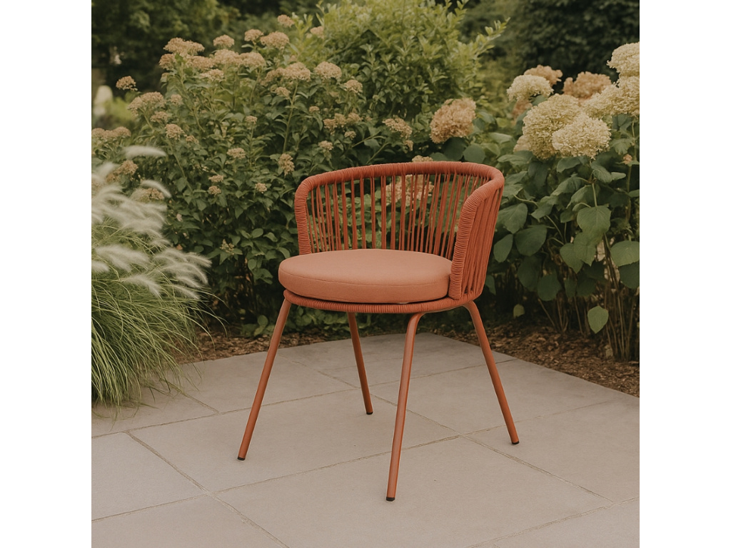 Zahradní židle Vilma v terakotově červeném odstínu propojuje eleganci s maximálním komfortem pro chvíle odpočinku pod širým nebem. Měkký polstrovaný sedák a opěrka s výpletem z odolné šňůry tvoří jemně zaoblený tvar, který přímo vybízí k usednutí. Ocelová konstrukce s povrchovou úpravou pro venkovní použití zajišťuje perfektní stabilitu i dlouhou životnost. Vilma skvěle zapadne do moderních, boho i rustikálních exteriérů – ať už na terase, balkoně nebo v zahradě.