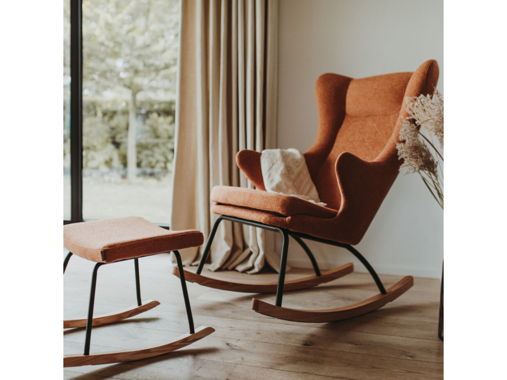 Terakotové houpací křeslo Quax De Luxe potěší každou maminku a vytvoří dokonalé místo na krmení i uspávání vašeho miminka. Příjemné čalounění a březové masivní ližiny je krásná kombinace do skandinávských i rustikálních interiérů. Černě lakovaná kovová podnož dodává celému křeslu elegantní a vzdušný nádech.
