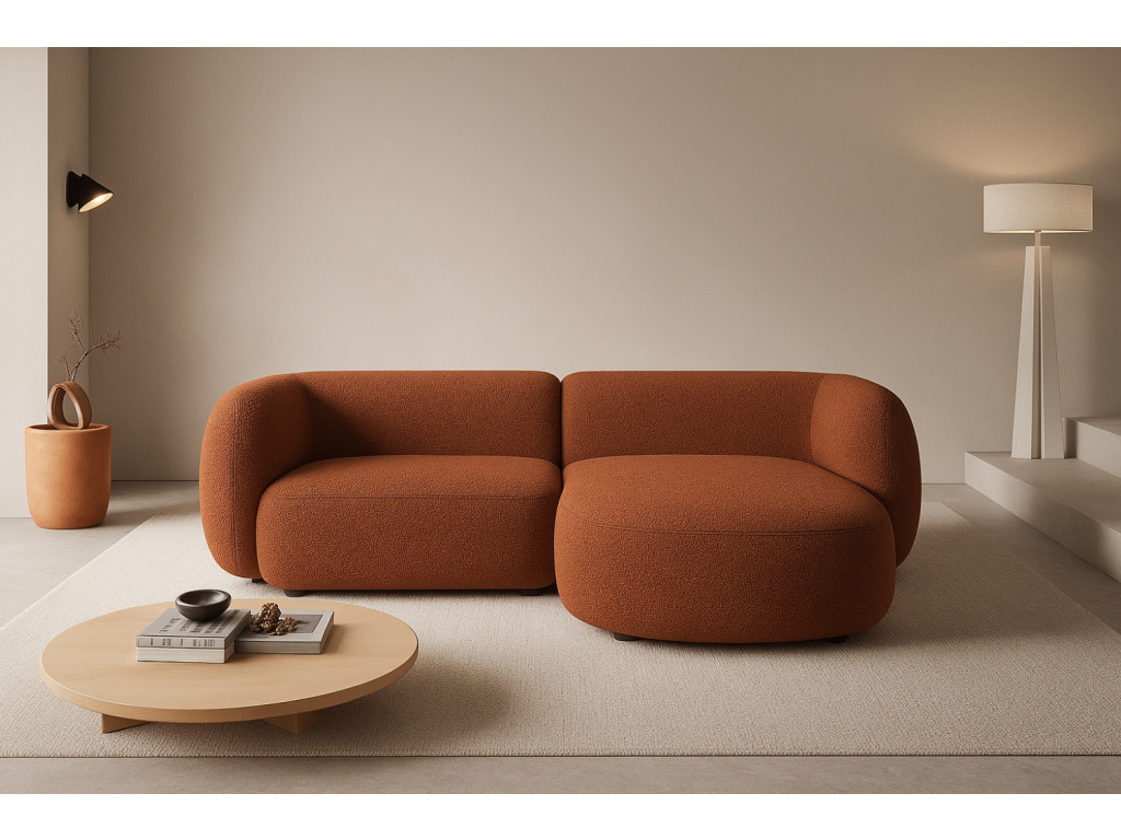 Více infoTerakotově oranžová bouclé rohová pohovka Kate 255 cm, pravá
