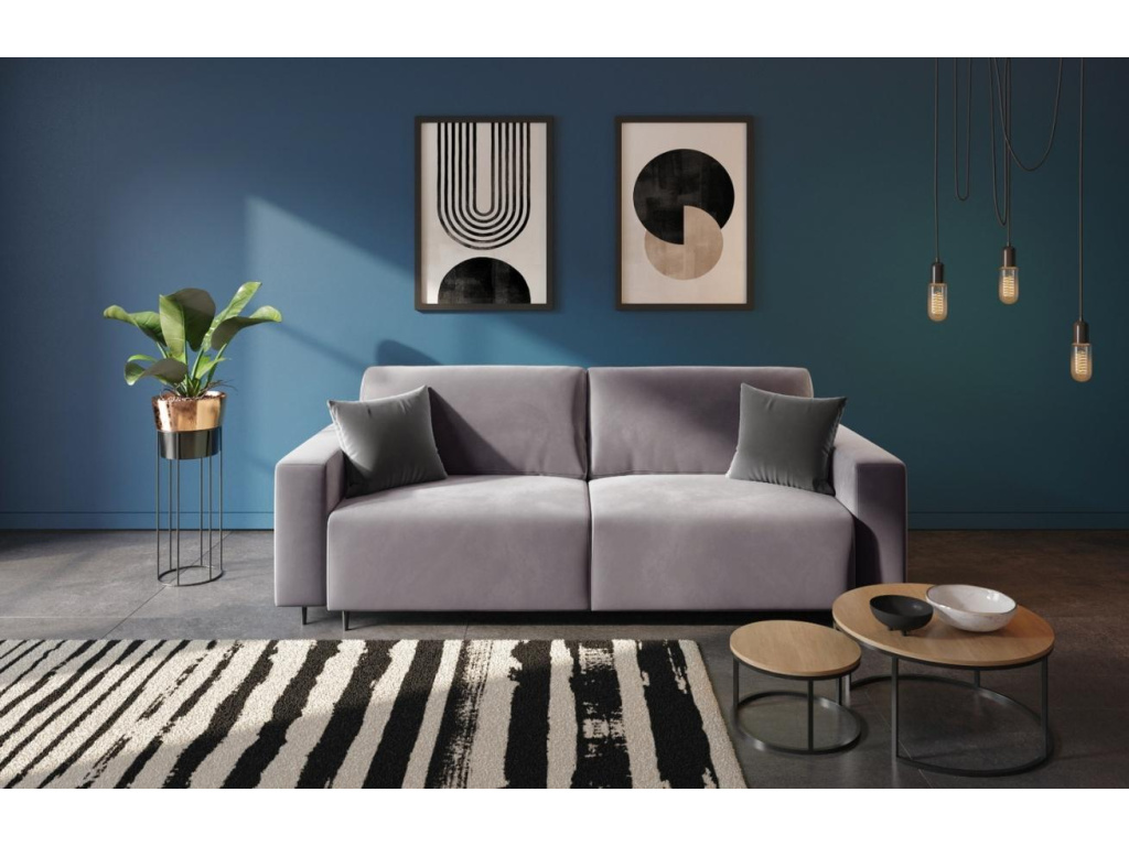 Třímístná pohovka Hesto je výrazný kus nábytku, který v sobě spojuje jednoduchost a eleganci. Robustní sedák pohovky kontrastuje se štíhlými nohami a vytváří ucelenou a vizuálně vyváženou kompozici. Díky použití extra silné pěnové vrstvy v sedací části poskytuje pohovka uživateli pohodlí a umožňuje vychutnat si komfort. Příjemné sametové čalounění v titanově šedé barvě designově kontrastuje s polštářky v tmavě šedém odstínu, díky čemuž získává originální design. Kromě toho byla pohovka rozšířena také o rozkládací funkci. Sklápěcí opěradla a výsuvná část sedáku umožňují rychlou přeměnu pohovky na pohodlné lůžko. Hesto se skvěle hodí do interiérů v elegantním stylu a do moderních interiérů. Její neokázalý charakter z ní činí zajímavý interiérový doplněk.