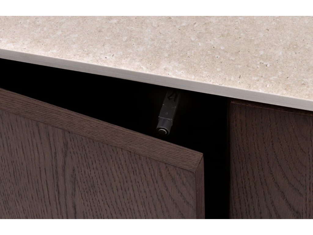 Komoda Eularia od značky MICADONI zaujme hned napoprvé – svými čistými liniemi, sochařskou elegancí a kontrastem materiálů, který působí vytříbeně, ale přirozeně. Eularia kombinuje tmavou dubovou dýhu s keramickou deskou a vytváří tak harmonii elegance, funkčnosti a promyšleného designu. Skvěle poslouží jako stylové zázemí pro vše, co má zůstat uklizené, ale přitom snadno dostupné – od nádobí až po dokumenty či sezónní dekorace. Díky svému vytříbenému vzhledu a kvalitnímu zpracování se Eularia hodí nejen do obývacího pokoje, ale i do ložnice či haly – zkrátka tam, kde chcete spojit praktičnost s estetikou.