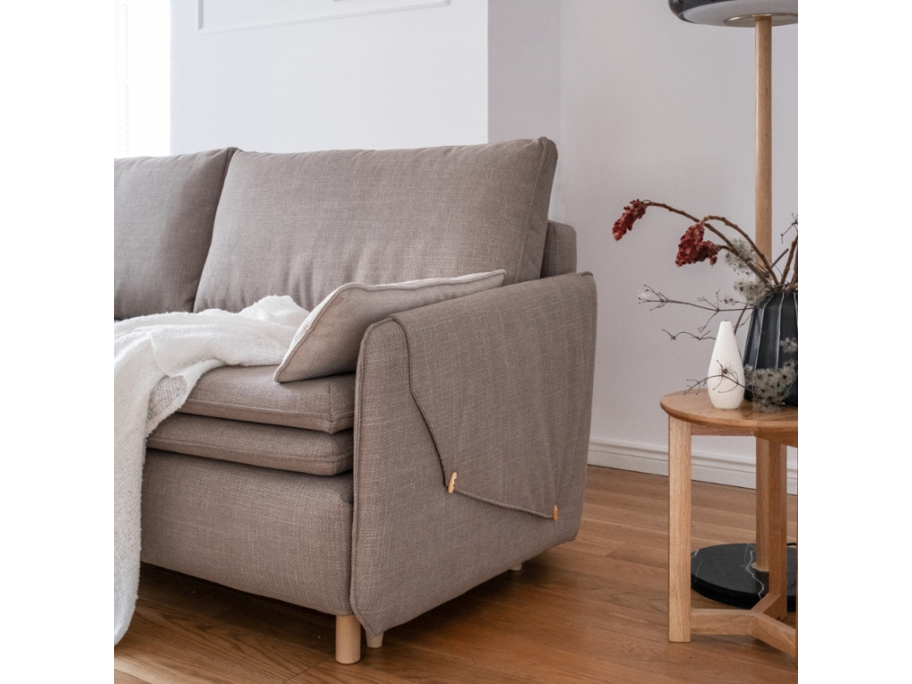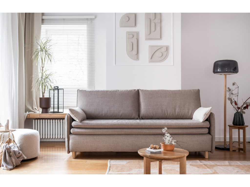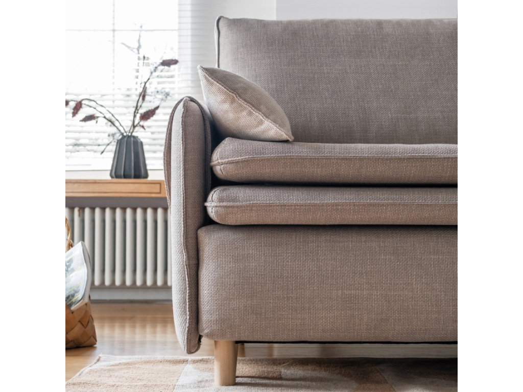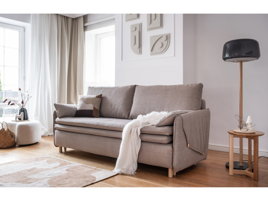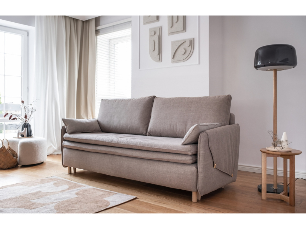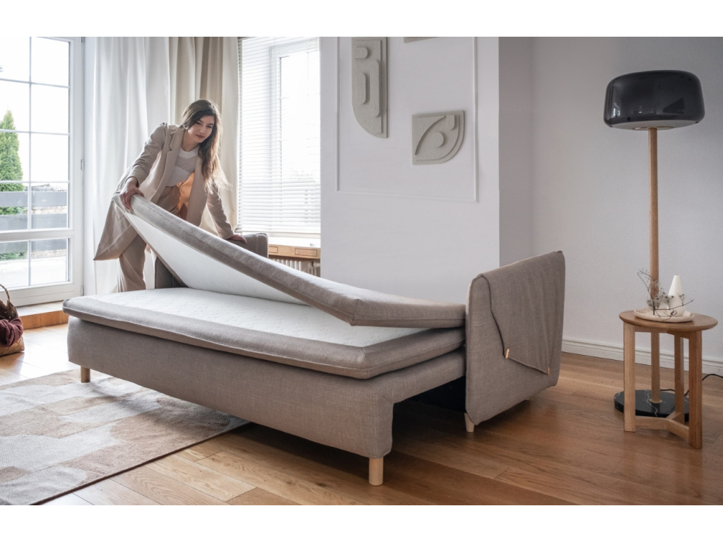 Rozkládací pohovka Simon od značky Miuform představuje ideální řešení do méně prostorných bytů. Pohovka je čalouněna příjemnou látkou, kterou po stranách zdobí dřevěné knoflíky. Zajímavostí této pohovky jsou úzké područky a vyšší dřevěná podnož, díky kterým působí lehkým a vzdušným dojmem. Pohodlný sedák snadno rozložíte na dvě matrace a rázem tak získáte místo na spaní o rozloze 140 x 190 cm. Pohovka nabízí také praktický úložný prostor, kam se pohodlně vejdou polštářky a deky.