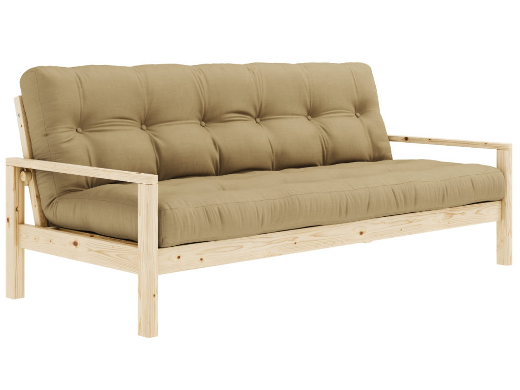 Pohovka nebo postel? Trojmístná rozkládací pohovka Knob od dánské značky Karup Design umí být obojím! Pod dřevěnými područkami se nachází dva nenápadné úchyty, které lze snadno odšroubovat a vy tak během chvilky získáte pohodlné lůžko pro vás nebo vaše hosty. Konstrukce z masivního borovicového dřeva s FSC certifikací je doplněna kvalitní 14cm futonovou matraci, která v sobě kombinuje recyklovaná vlákna a 4 cm pěny. Pohovka Knob fantasticky zapadne do skandinávských a japonských stylů interiérů, do kterých vnese jednoduchost, eleganci a ryzí funkčnost. Představuje skvělé řešení zejména pro menší prostory, do kterých přinese další místo na spaní. Vybrat si ji můžete v další barvě konstrukce či v mnoha barvách matrací.