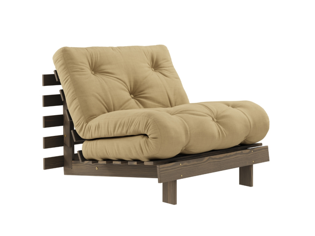 Rozkládací křeslo Roots od značky Karup Design se rychle stane vaším oblíbeným společníkem při chvilkách odpočinku. Elegantní a stylové křeslo proměníte jednoduchým pohybem na praktické a pohodlné lůžko. Konstrukce z hnědého masivního borovicového dřeva s FSC certifikací je doplněna kvalitní 12 cm vysokou futonovou matrací, která v sobě kombinuje recyklovaná vlákna a 4 cm pěnu. Křeslo Roots skvěle doplní skandinávsky a minimalisticky laděné domovy. Ideální je například pro menší interiéry, kde oceníte další místo na spaní. Vybrat si ho můžete v široké škále barev.