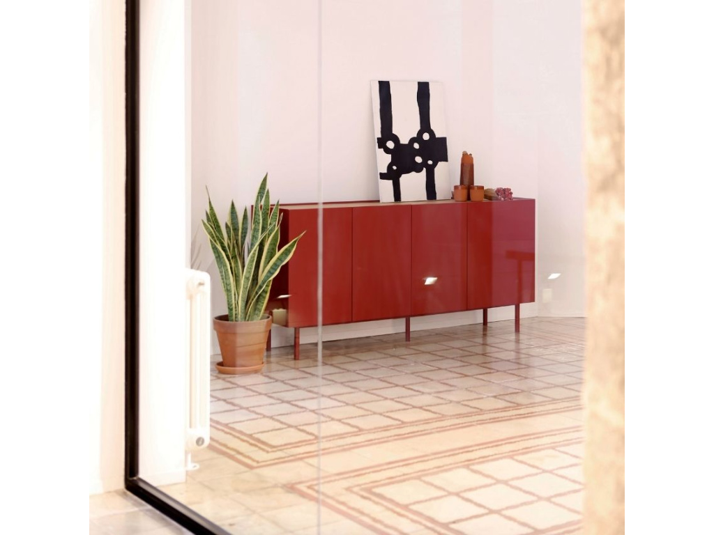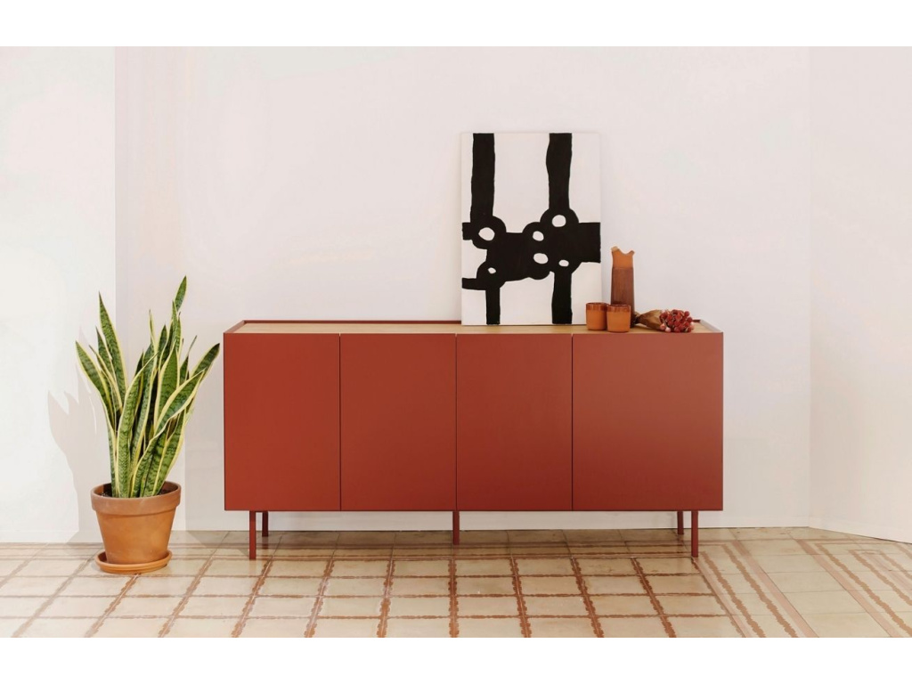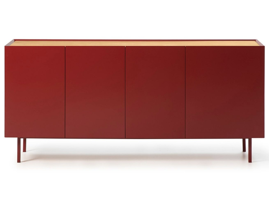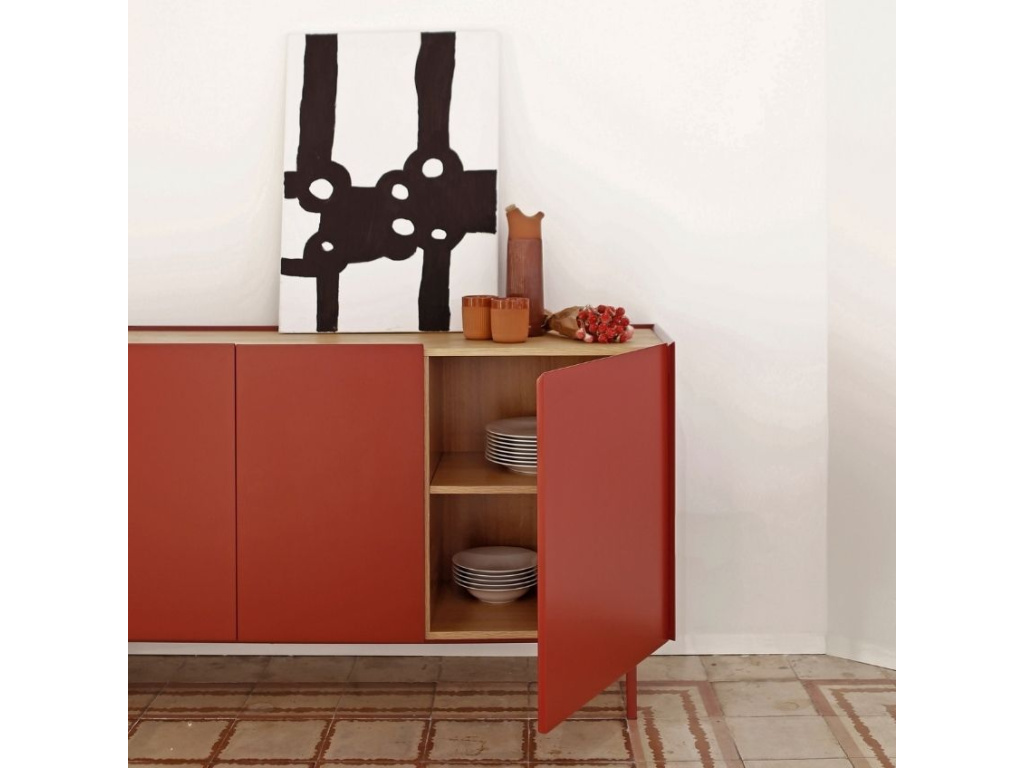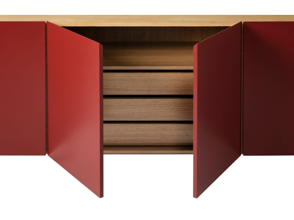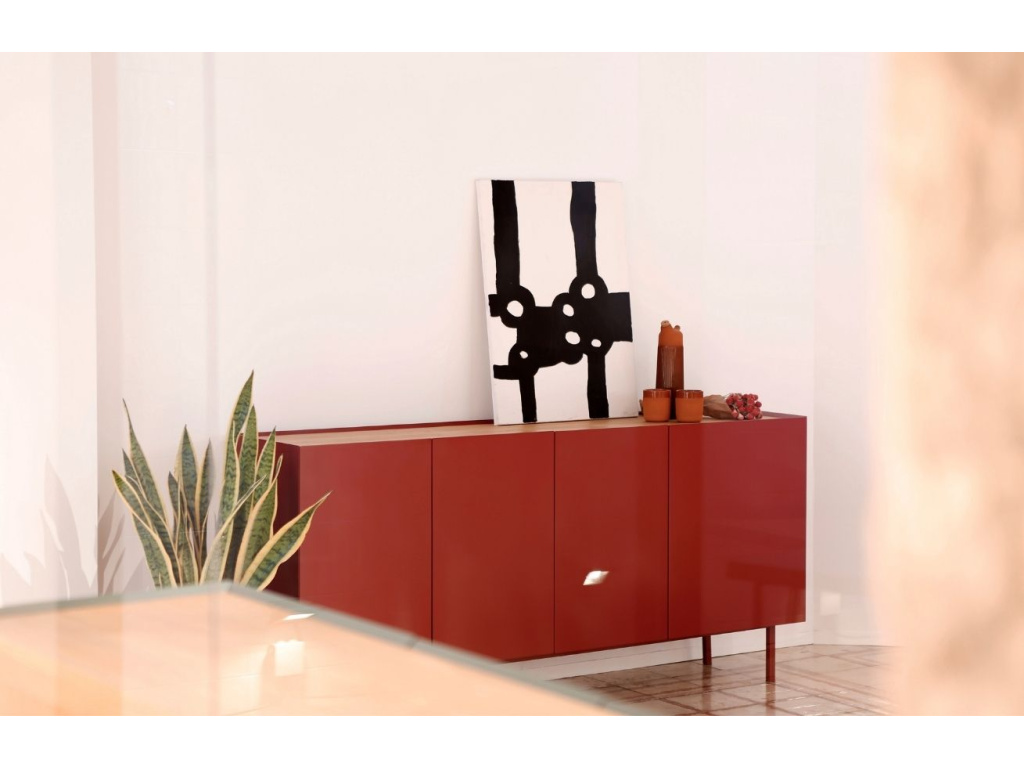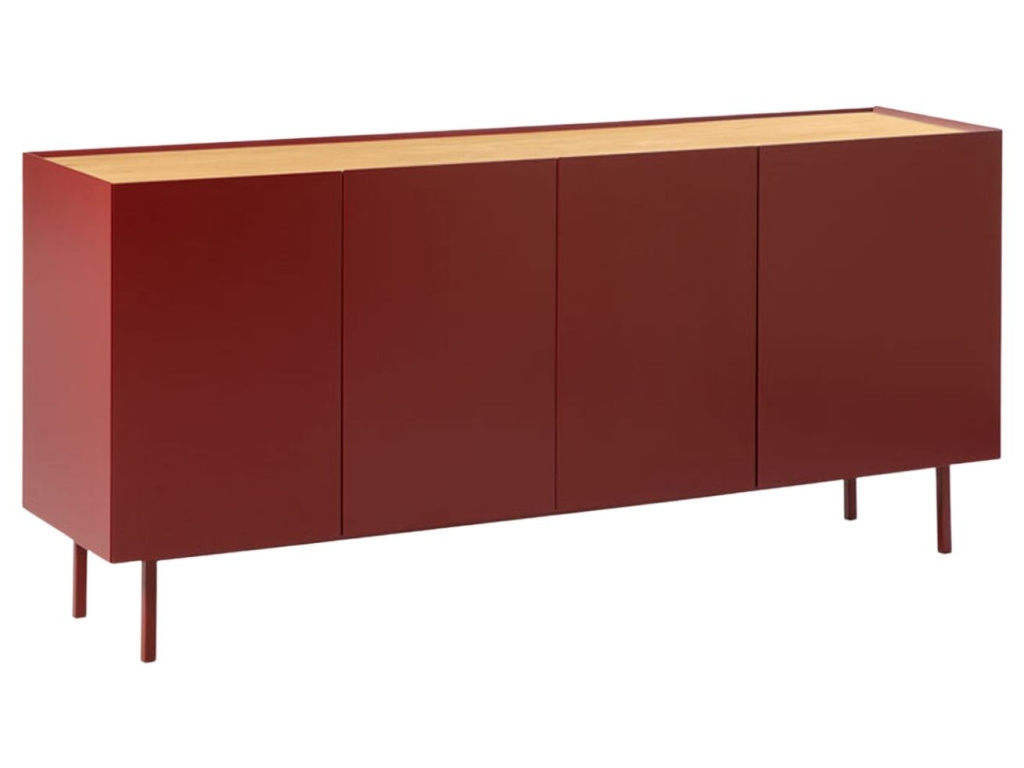 Komoda Teulat Arista bude stylovou ozdobou každého moderního interiéru obývacího pokoje i ložnice. Dominantní tmavě červená barva podtrhuje minimalistický design této komody, se kterým kontrastuje vrchní deska s dubovou dýhou v přírodním odstínu. Úložný prostor je prakticky rozčleněn do polic a výsuvných zásuvek, což vám bude ulehčovat organizaci vašeho inventáře. Moderní styl komody podtrhuje tenká lakovaná kovová podnož, která barevně ladí se zbytkem komody.