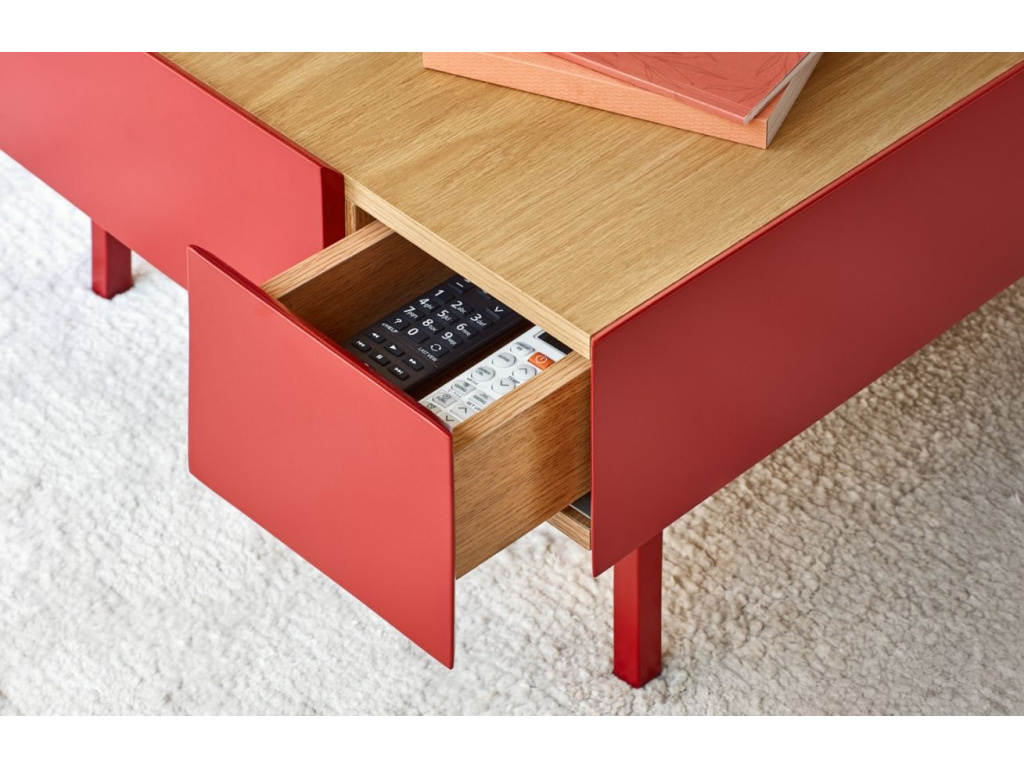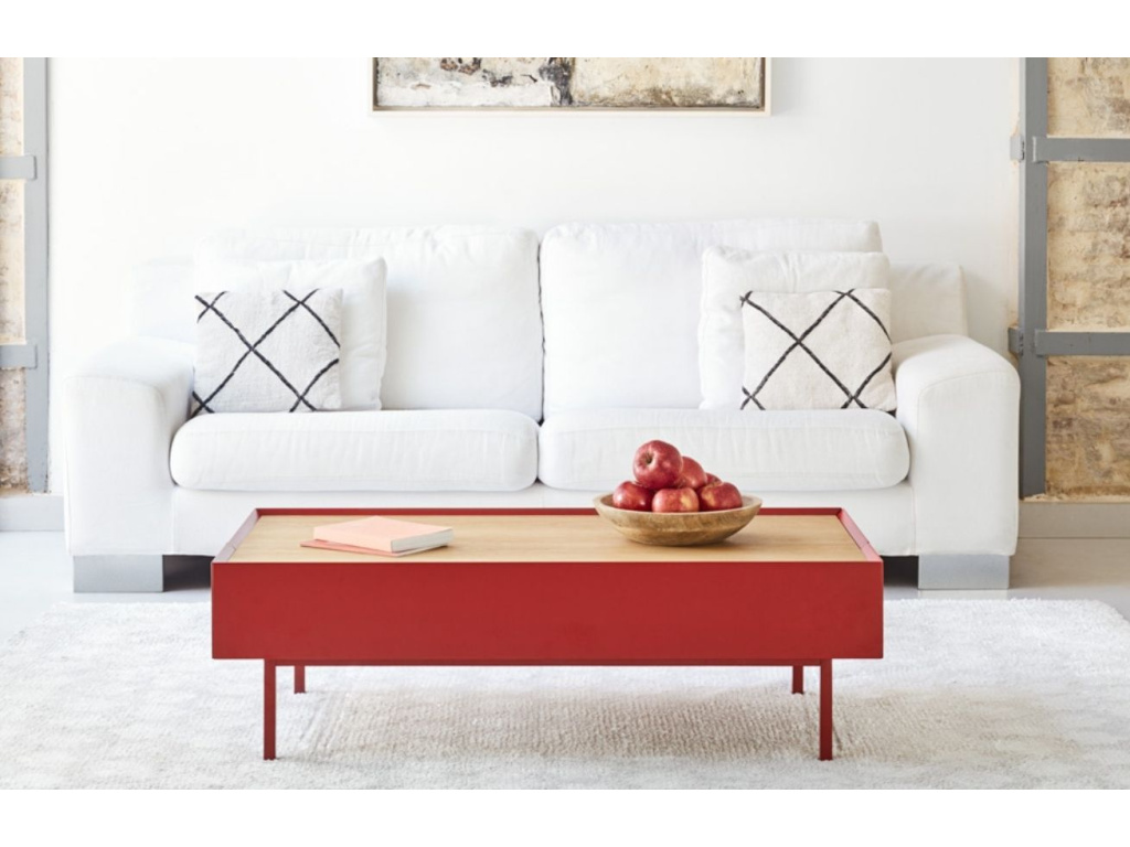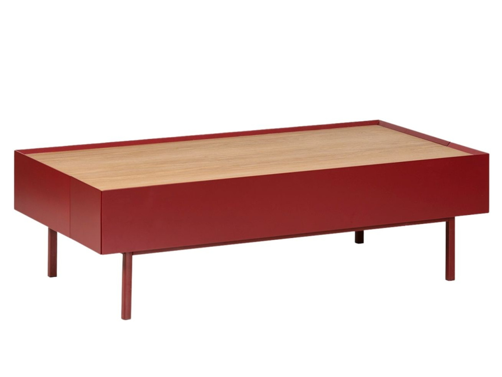 Konferenční stolek Teulat Arista bude stylovou ozdobou každého obývacího pokoje. Dominantní tmavě červená barva podtrhuje minimalistický design stolku, se kterým kontrastuje vrchní deska s dubovou dýhou v přírodním odstínu. U stolku vás potěší i úložný prostor v podobě výsuvných zásuvek, což vám bude ulehčovat organizaci a úklid vašeho inventáře. Moderní styl stolku podtrhuje tenká lakovaná kovová podnož, která barevně ladí se zbytkem stolku.