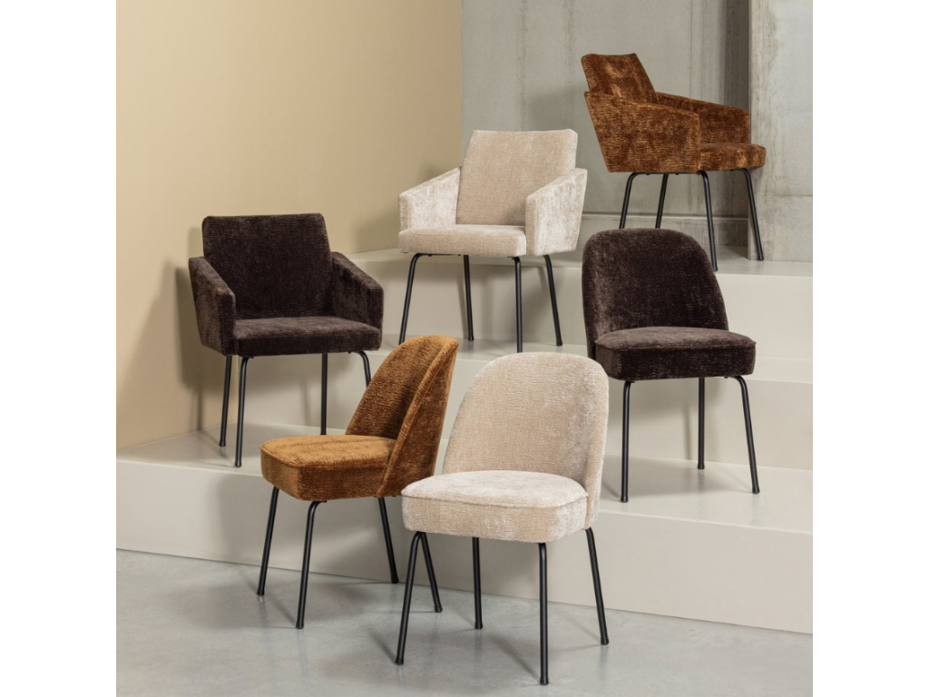 Jídelní židle Tergi od značky WOOOD je ideálním společníkem pro příjemné rodinné večeře nebo posezení s přáteli. Atraktivní design s nádechem luxusu a klasiky jsou přesnými známkami židle Tergi. O vaše pohodlí se postará žinylkové čalounění v tmavě hnědém odstínu, které je odolné proti oděru a zároveň příjemné na dotek. Probarvené nitě vytvářejí poutavou 3D strukturu se stínovým a lesklým efektem. Černě lakovaná kovová podnož podtrhává celkový design židle. Kolekce Tergi zahrnuje také křesla, barové židle či lavice.