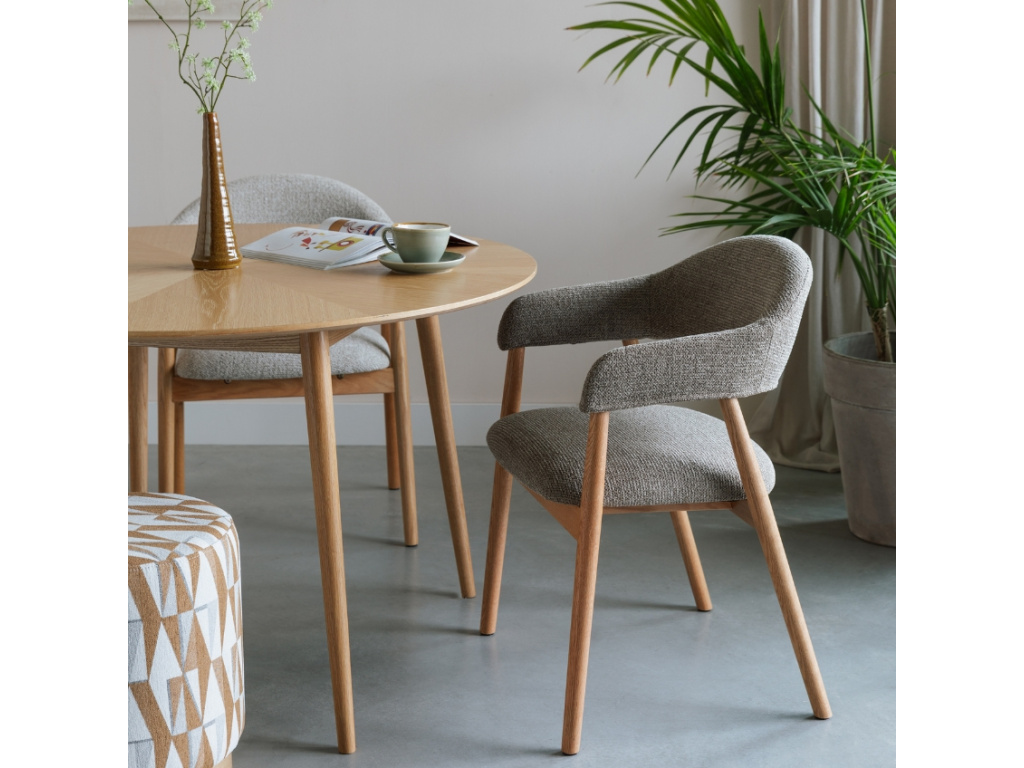 Jídelní židle INDY se pyšní jednoduchým designem s lehkým nádechem retra. Její sedák i prostorné opěradlo jsou čalounění příjemnou látkou, která zaujme svou jemnou strukturou. INDY stojí na podnoži z masivního dubu a pořídit si ji můžete také ve variantě se světle hnědým čalouněním. Umístit ji můžete nejen k jídelnímu stolu, skvěle vypadat bude také v pracovně nebo u toaletního stolku.
