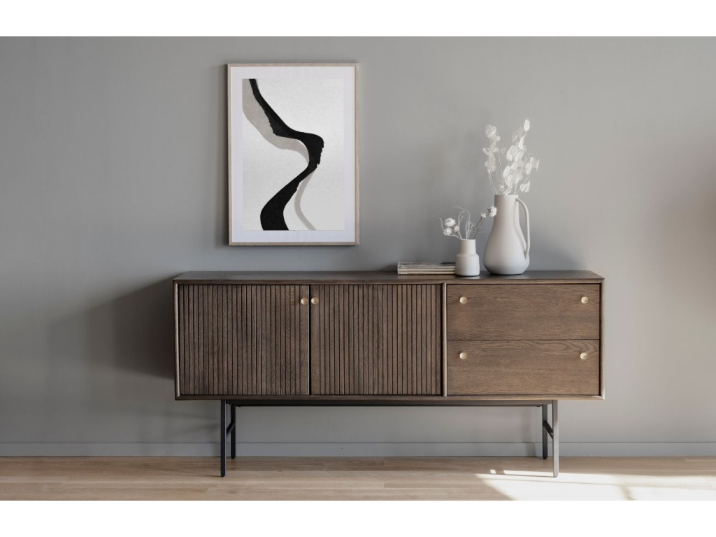 Praktická a elegantní - taková je komoda ROWICO CLEARBROOK. Nabízí úložný prostor v podobě dvou zásuvek a čtyř uzavřených polic. Komoda je vyrobena z tmavě hnědé dubové dýhy s masivními hranami a stojí na originálně tvarované kovové podnoži. Podnož je nalakována černou barvou a korpus komody přes ní na obou stranách výrazně přesahuje, díky čemuž komoda působí vzdušným dojmem. Na zásuvkách i dvířkách najdete drobné mosazné úchytky.