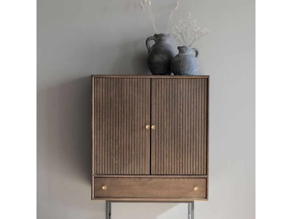 Praktická a elegantní - taková je komoda ROWICO CLEARBROOK. Nabízí úložný prostor v podobě jedné zásuvky a dvou uzavřených polic. Komoda je vyrobena z tmavě hnědé dubové dýhy s masivními hranami a stojí na originálně tvarované kovové podnoži. Podnož je nalakována černou barvou a korpus komody přes ní na obou stranách výrazně přesahuje, díky čemuž komoda působí vzdušným dojmem. Na zásuvkách i dvířkách najdete drobné mosazné úchytky.