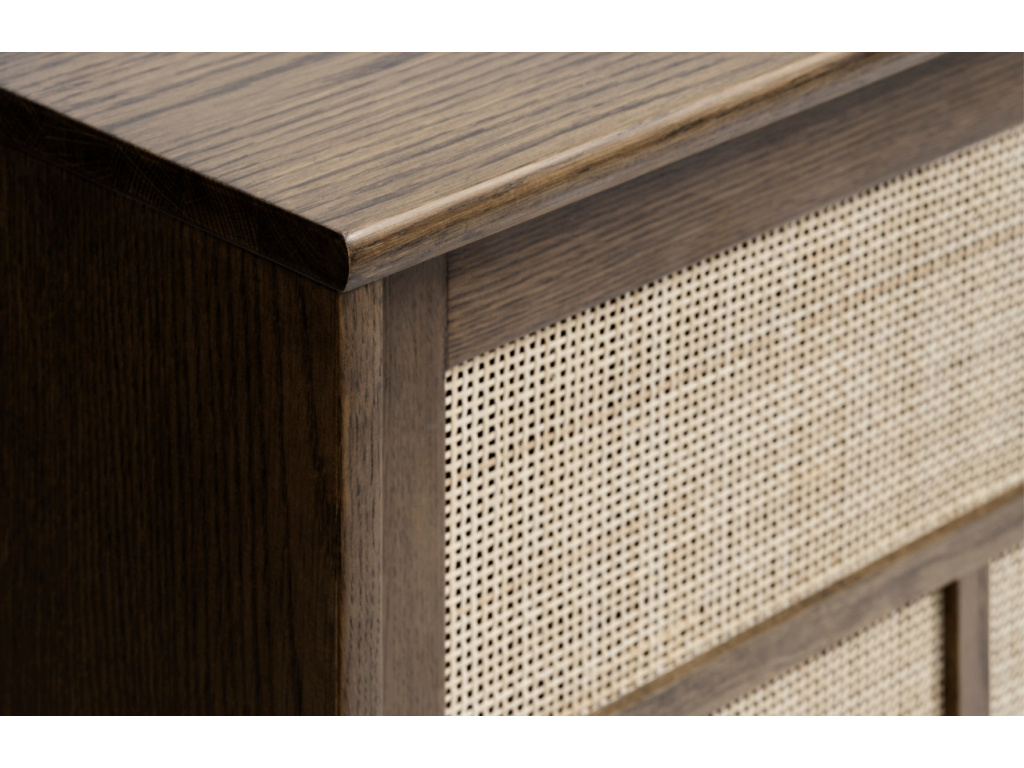 Komoda Barrali od značky Unique Furniture nabízí praktický úložný prostor v podobě 4 polic a jedné zásuvky, které jsou urkyty za posuvnými dvířky. Díky kombinaci tmavě hnědé dubové dýhy a ratanu přenese kousek přírody i do vašeho domova. Vysoká podnož nejen že dodává produktu na eleganci, ale také se skvěle hodí do domácností s robotickým vysavačem. Pokud hledáte stylovou a praktickou komodu, s Barrali určitě neuděláte chybu. Ve stejnojmenné sérii navíc najdete více designově sladěných produktů, které se budou v interiéru skvěle doplňovat.