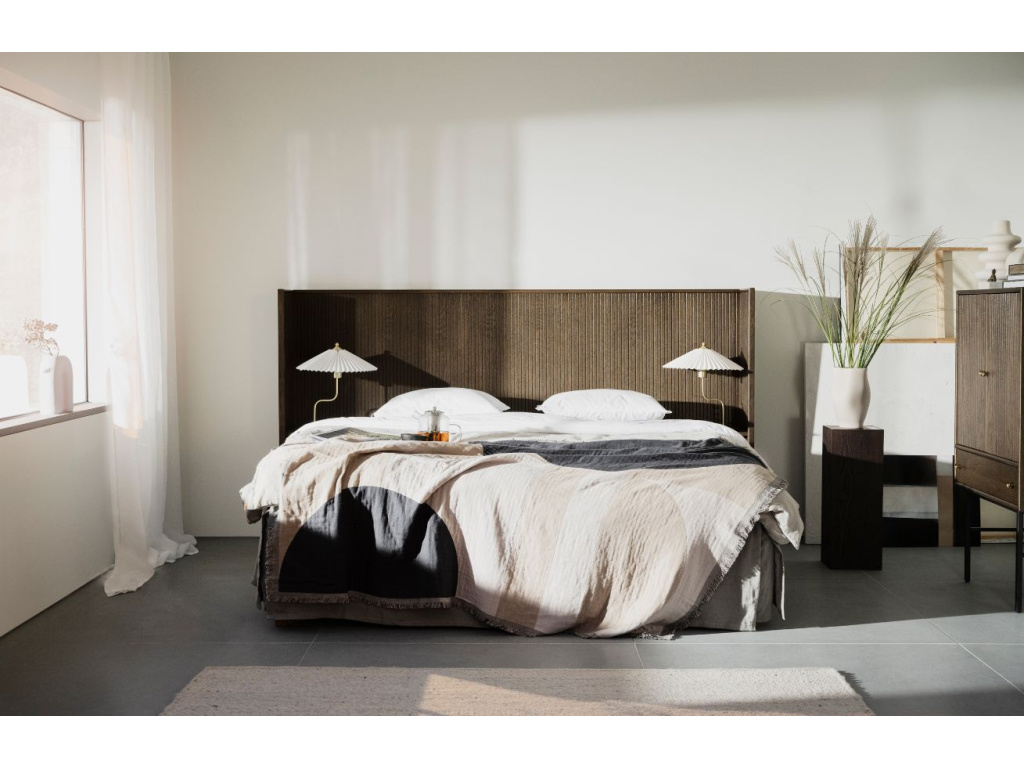 Čelo EDMOND značky ROWICO z tmavě hnědé dubové dýhy dodá vaší ložnici nádech luxusu a elegance. Navíc s sebou přinese i praktický odkládací prostor - najdete na něm celkem čtyři police. Ty poslouží jako noční stolky, perfektně se hodí k odložení rozečtené knížky i k umístění budíku. Čelo je dodáváno včetně držáků pro připevnění ke stěně a díky nastavitelné kovové podnoži si můžete sami zvolit jeho výšku. Vaše ložnice bude vypadat skvěle v kombinaci s komodami ROWICO CLEARBROOK, které mají stejnou barvu a jsou zdobeny stejným žebrovaným vzorem.