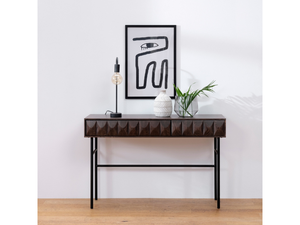 Toaletní stolek Latina od značky Unique Furniture nabízí prostorné uložiště v podobě dvou zásuvek, které zaujmou jedinečným vzorováním s reliéfním charakterem. Vrchní část stolu je vyrobena z tmavě hnědého masivního dubu, v kombinaci s černě lakovanou kovovou podnoží, dodávají toaletnímu stolku moderní charakter. Pokud hledáte neobyčejný kousek do ložnice či předsíně, toaletní stolek Latina vás rozhodně nezklame. Navíc pochází z celé série produktů, takže můžete úložné prostory ve vašem interiéru dokonale sladit.