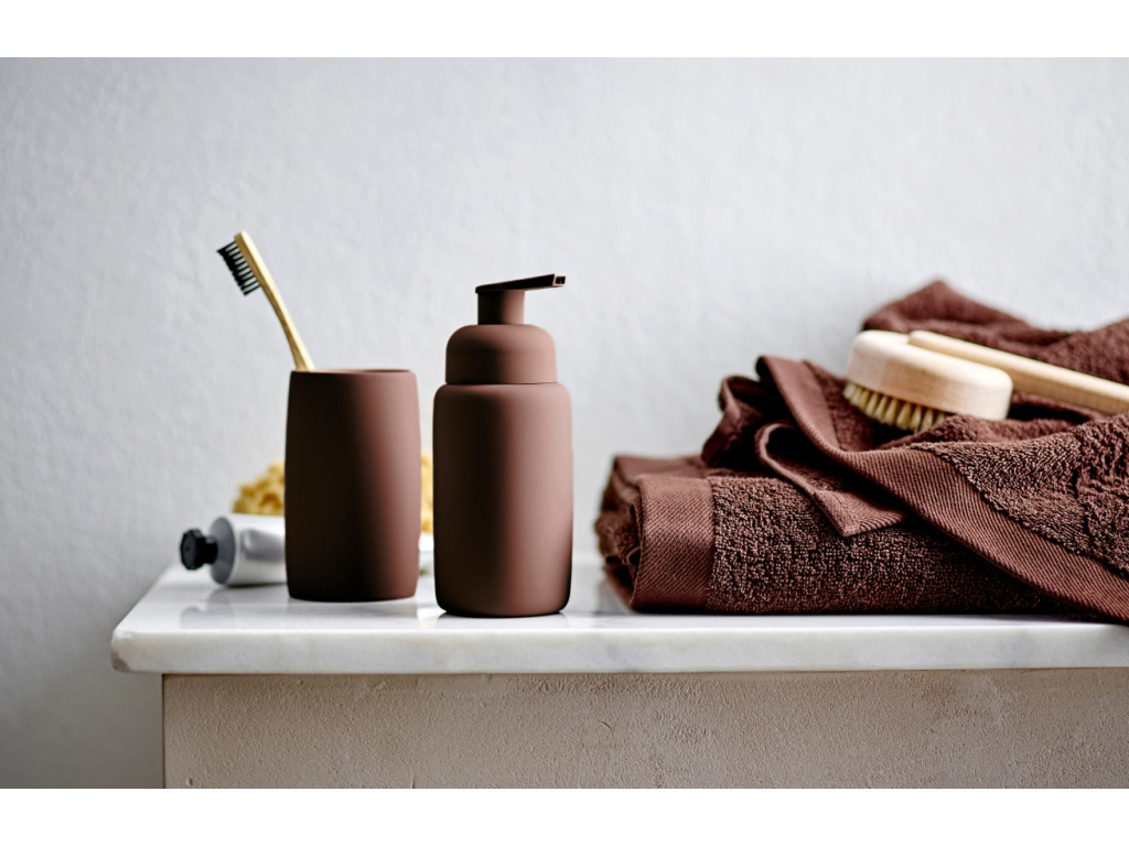 Jednoduchý dávkovač mýdla Mono od dánské značky Södahl bude slušet každé moderní minimalistické koupelně. Dávkovač je vyroben z odolné kameniny s matným pogumovaným povrchem v neutrální hnědé barvě, která vynikne ve světlém i barevném interiéru. Hladký povrch a monochromatická barva utváří jednotný design, který můžete umocnit spolu s dalšími koupelnovými doplňky z kolekce Mono.