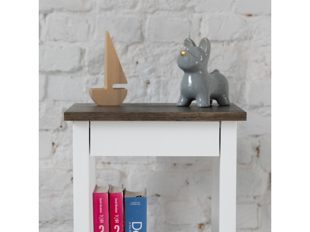 RAGABA ENTLIK je praktickým stolkem do domácnosti v čistém jednoduchém designu. Deska stolku je vyrobena z dubové dýhy a doplňuje ji vysoká podnož z bukového masivu. Výhodou stolku je nenápadná zásuvka, která však poskytne dostatečné úložiště na vaše drobnosti. Zásuvka je opatřena tlumičem, proto se nemusíte bát případných nárazů nebo brzkého opotřebení. Praktickým prvkem je také police, kam můžete umístit oblíbené knihy či dekorace a květiny. Stolek bude skvělým doplňkem do obývacího pokoje i jako noční stolek do ložnice.