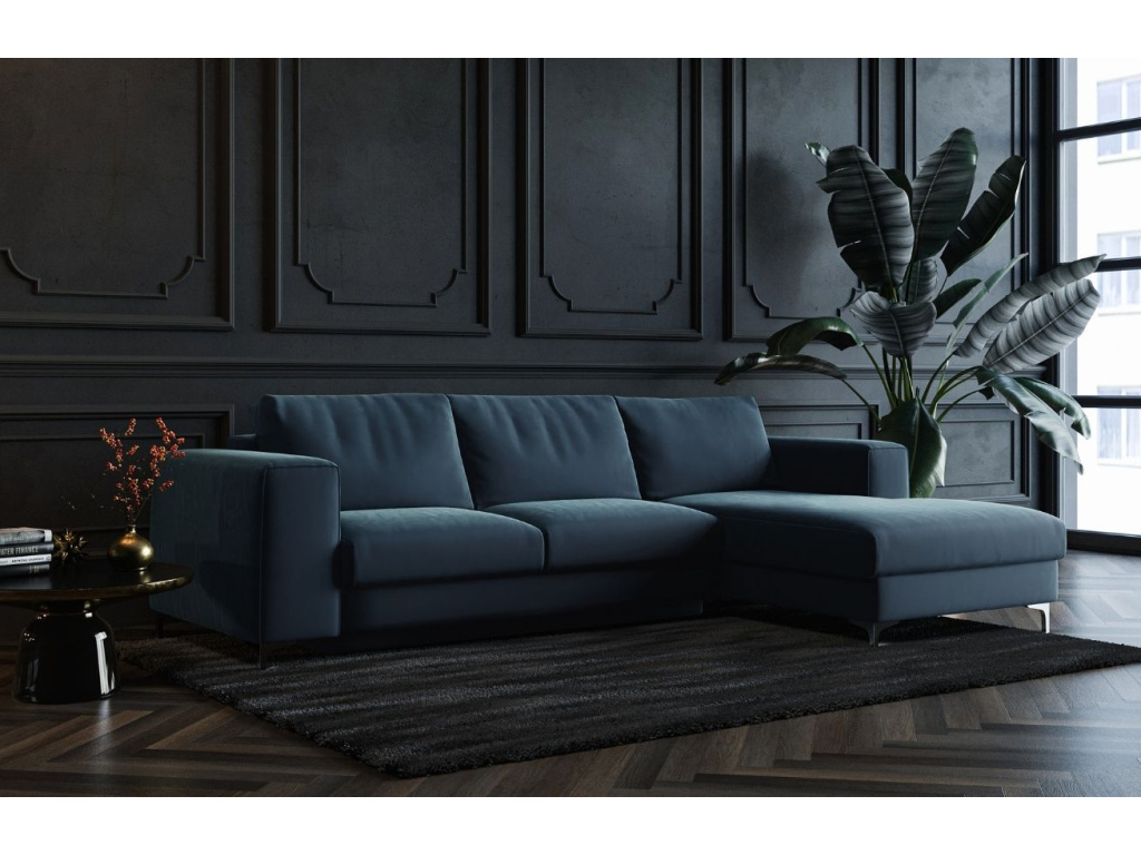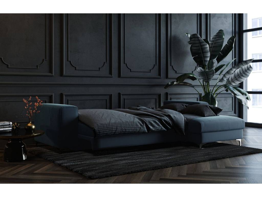 Stylová a luxusní designová rohová pohovka DEVICHY Rothe se díky svému jedinečnému a minimalistickému tvaru stane nepřehlédnutelnou součástí vaší domácnosti. Stabilní kovová podnož je dokonale doplněna o čalounění z kvalitní sametové tkaniny v tmavě modrém provedení, která je charakteristická pro svou nadprůměrnou odolnost a speciální vodě odpudivou úpravu. Pohovku DEVICHY Rothe navíc snadno můžete proměnit na pohodlné a dostatečně velké lůžko, díky jednoduchému rozkladu. Reprezentativní a exkluzivní vzhled dokonale kombinuje pohodlí a styl.
