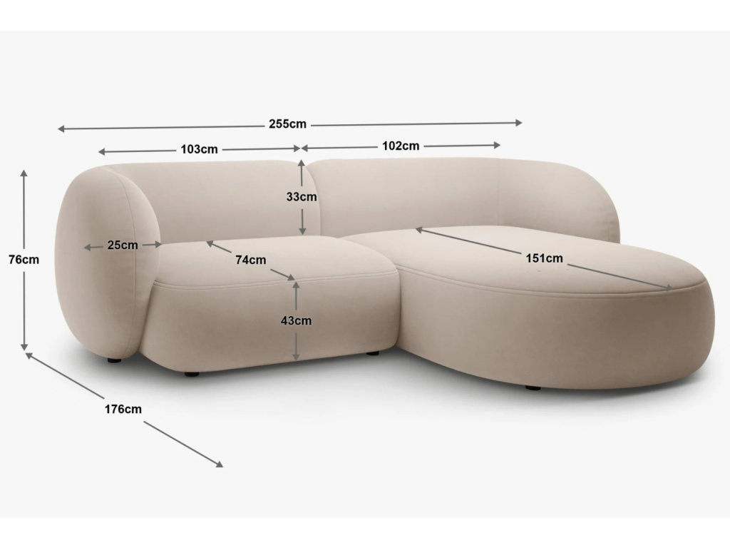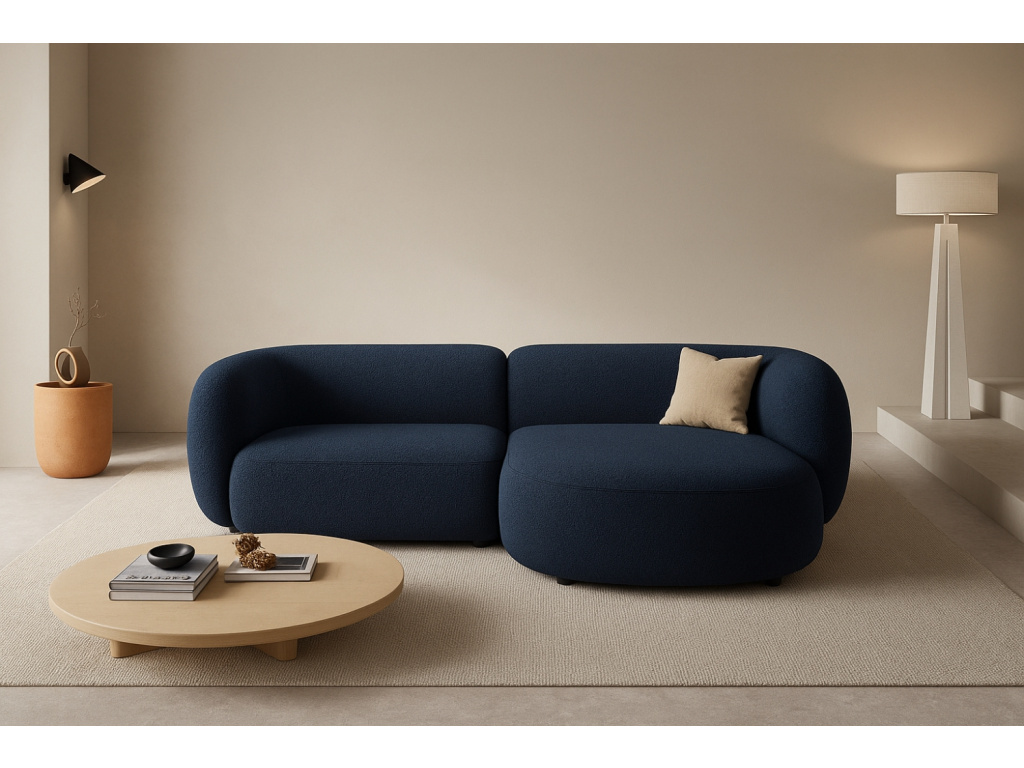 Více infoTmavě modrá bouclé rohová pohovka Kate 255 cm, pravá