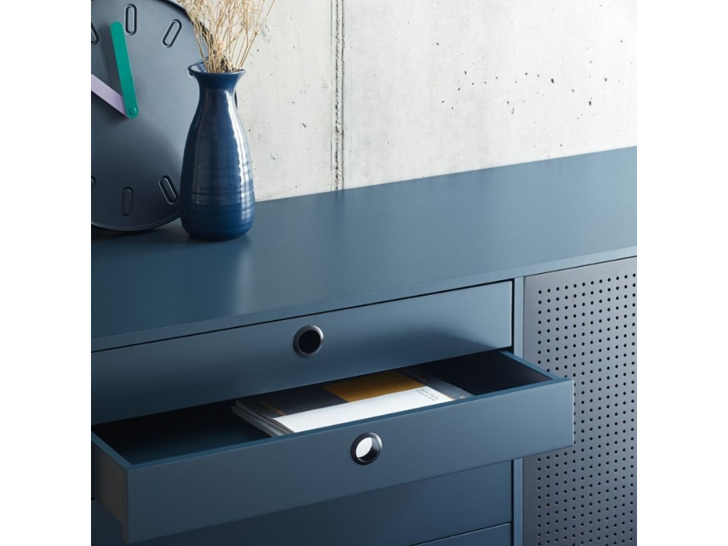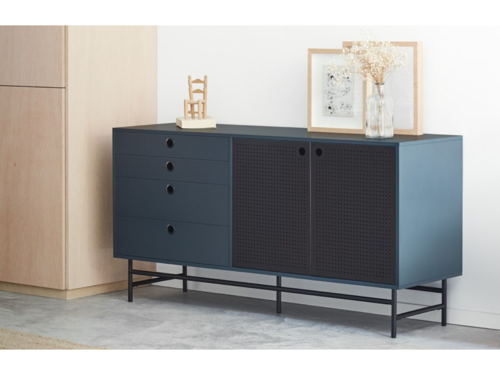 Tmavě modrá komoda Teulat Punto zaujme kombinací materiálů a designem s lehkým nádechem industriálního stylu, díky kterému komoda krásně vynikne v každém moderně zařízeném interiéru. Korpus komody je z MDF se zajímavým designovým prvkem v podobě děrovaných černých kovových dvířek a úchytů pro snadnější vysouvání zásuvek. Celek doplňuje tenká a elegantní kovová podnož v černé barvě. Úložný prostor je prakticky rozdělen do výsuvných zásuvek a polic za uzavíratelnými dvířky, což napomáhá k snadnější organizaci a rychlejšímu úklidu.