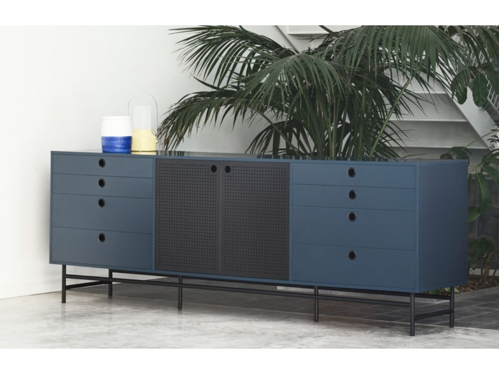 Tmavě modrá komoda Teulat Punto zaujme kombinací materiálů a designem s lehkým nádechem industriálního stylu, díky kterému komoda krásně vynikne v každém moderně zařízeném interiéru. Korpus komody je z MDF se zajímavým designovým prvkem v podobě děrovaných černých kovových dvířek a úchytů pro snadnější vysouvání zásuvek. Celek doplňuje tenká a elegantní kovová podnož v černé barvě. Úložný prostor je prakticky rozdělen do výsuvných zásuvek a polic za uzavíratelnými dvířky, což napomáhá k snadnější organizaci a rychlejšímu úklidu.
