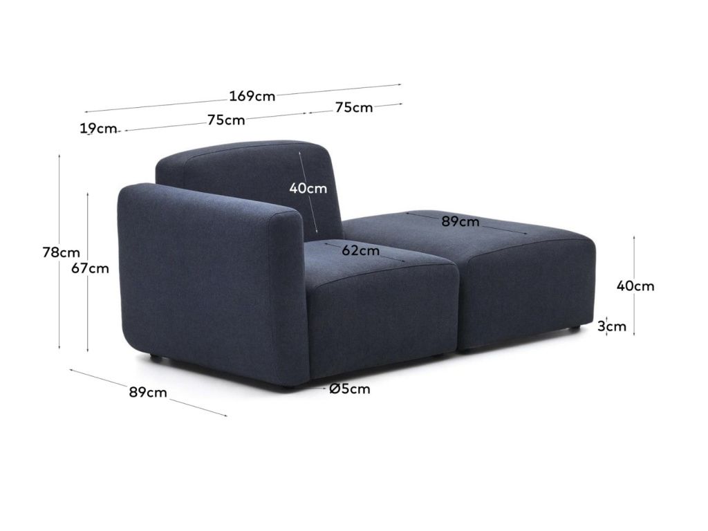 Dvoumístná rohová pohovka Kave Home Neom pochází z modulární série, díky které si můžete vytvořit pohovku přesně podle vašich potřeb. Snadno si zvolíte, jestli chcete levý nebo pravý roh a můžete ji kdykoliv rozšířit o další moduly. Vyberte si jednotlivé části a seskládejte je tak, aby vyhovovali velikosti vašeho obývacího pokoje a vy jste získali přesně tolik místa k sezení, kolik potřebujete. A když vás přestane současné rozmístění bavit, můžete pohovku kdykoliv zase přeskládat! Pohovka je čalouněná kvalitní látkou v tmavě modrém odstínu, která díky vysokému martindale může být bez problémů využita nejen v domácnostech, ale také v komerčních prostorech. Celá série je dostupná také v béžovém provedení.