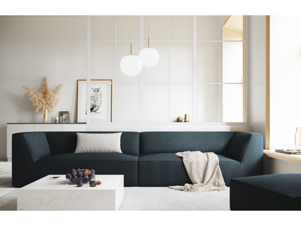 Čtyřmístná pohovka Ruby od společnosti Micadoni se stane příjemným doplňkem vašeho obývacího pokoje. Matná manšestrová tkanina, se strukturovaným dekorem v podobě proužků, je velmi příjemná na dotek. Látka je pokryta hydrofobní vrstvou, která chrání před rychlou absorpcí rozlité kapaliny do struktury nábytku. Navíc disponuje vysokou odolností proti oděru. Kombinací různých modulů a velikostí pohovky si můžete vytvořit konfigurace sezení podle svých představ. Sezení Ruby doporučujeme spojit s jednoduchým konferenčním stolkem, na který můžete umístit svíčky, dekorace nebo občerstvení. Díky tomu získáte jednoduchou, ale sofistikovanou skandinávskou obývací sestavu.