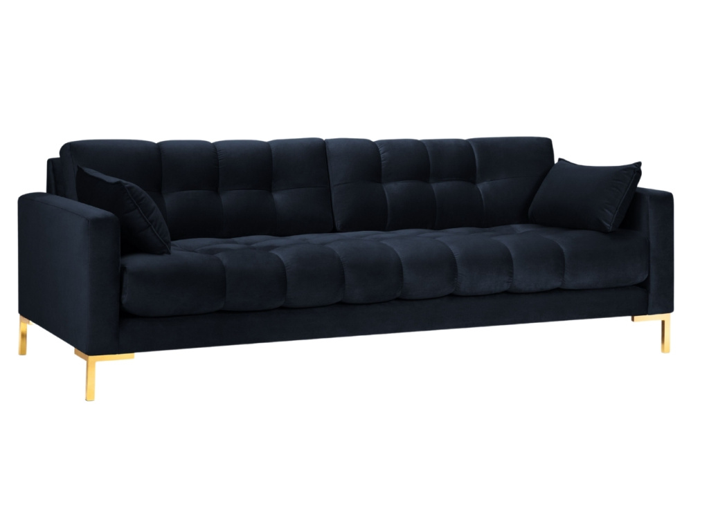 Elegantní čtyřmístná pohovka MICADONI MAMAIA zaujme na první pohled svým nadýchaným vzhledem. Velmi příjemné sametové čalounění a zlatá kovová podnož vytváří kontrast, který interiéru dodá elegantní vzhled a nádech luxusu. Díky zajímavému prošívání vzniká jemný design, který do vašeho domova vnese lehkost a styl. Opěrné polštářky zvednou úroveň vašeho odpočinku o stupeň výš. Nechte se obklopit komfortem ve společnosti pohovky Mamaia.
