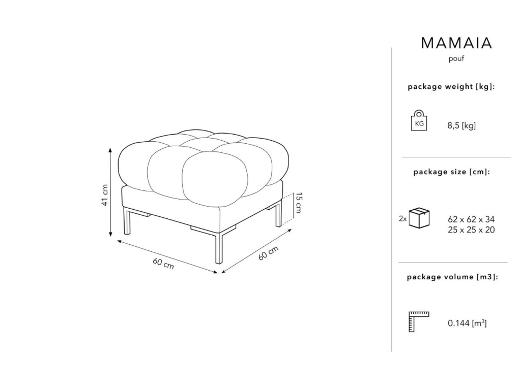 Elegantní podnožka MICADONI MAMAIA zaujme na první pohled svým nadýchaným vzhledem. Velmi příjemné sametové čalounění a kovová podnož vytváří kontrast, který interiéru dodá elegantní vzhled a nádech luxusu. Díky zajímavému prošívání vzniká jemný design, který do vašeho domova vnese lehkost a styl. Nechte se obklopit komfortem ve společnosti produktů Mamaia.