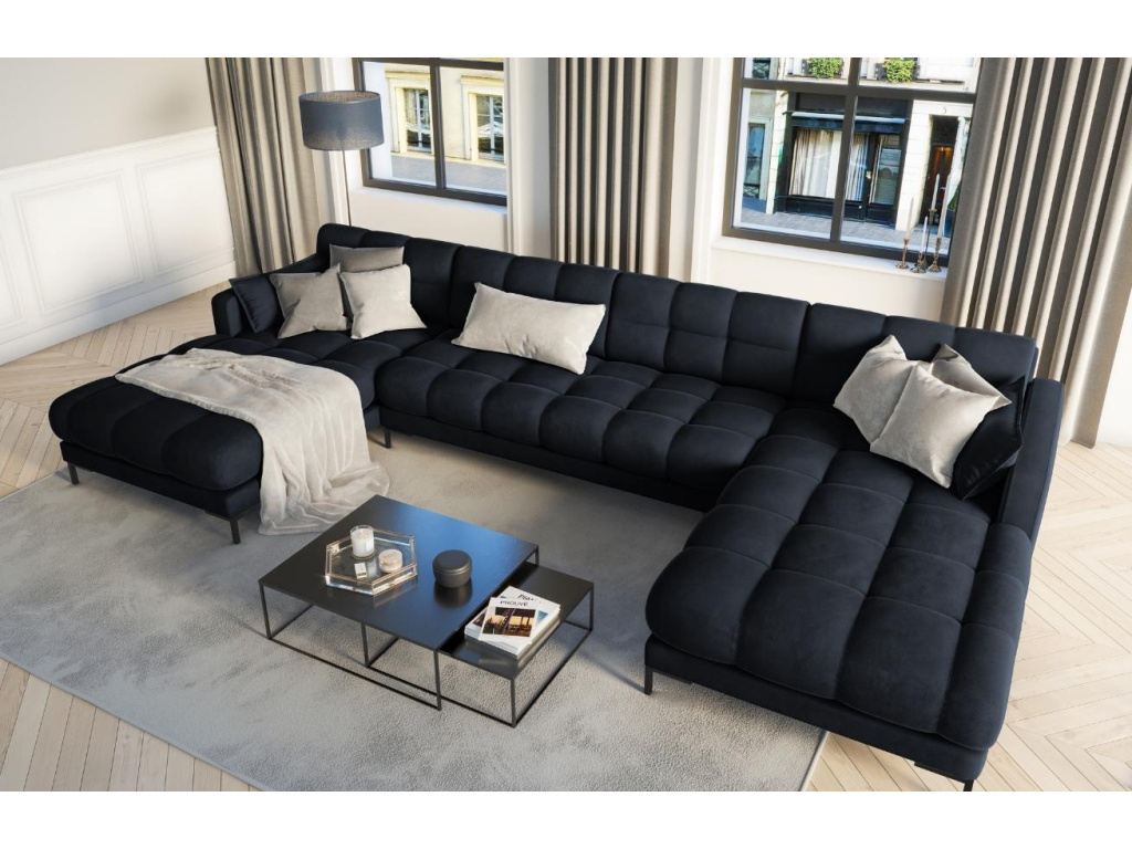 Elegantní šestimístná rohová pohovka MICADONI MAMAIA zaujme na první pohled svým nadýchaným vzhledem. Velmi příjemné sametové čalounění v tmavě modré barvě a kovová podnož vytváří kontrast, který interiéru dodá elegantní vzhled a nádech luxusu. Díky zajímavému prošívání vzniká jemný design, který do vašeho domova vnese lehkost a styl. Opěrné polštářky zvednou úroveň vašeho odpočinku o stupeň výš. Díky praktickému tvaru do písmene U získáte rovnoměrně rozdělená místa k odpočinku. Nechte se obklopit komfortem ve společnosti produktů Mamaia.