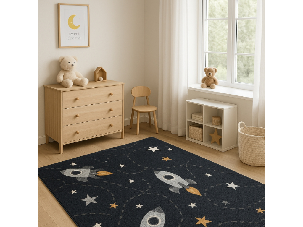 Koberec Fast Rockets s motivem létajících raket mezi hvězdičkami poskytne zázemí na hraní nebo čtení pohádek. Na dotyk měkký a hebký materiál příjemně hřeje a poskytne pohodlí. Koberec se snadno čistí a díky polypropylenové přízi má antialergenní a antistatické vlastnosti. Originální design s vesmírným motivem a kontrastními barvami potěší zejména malé raubíře, a skvěle tak zapadne do chlapeckého pokoje.