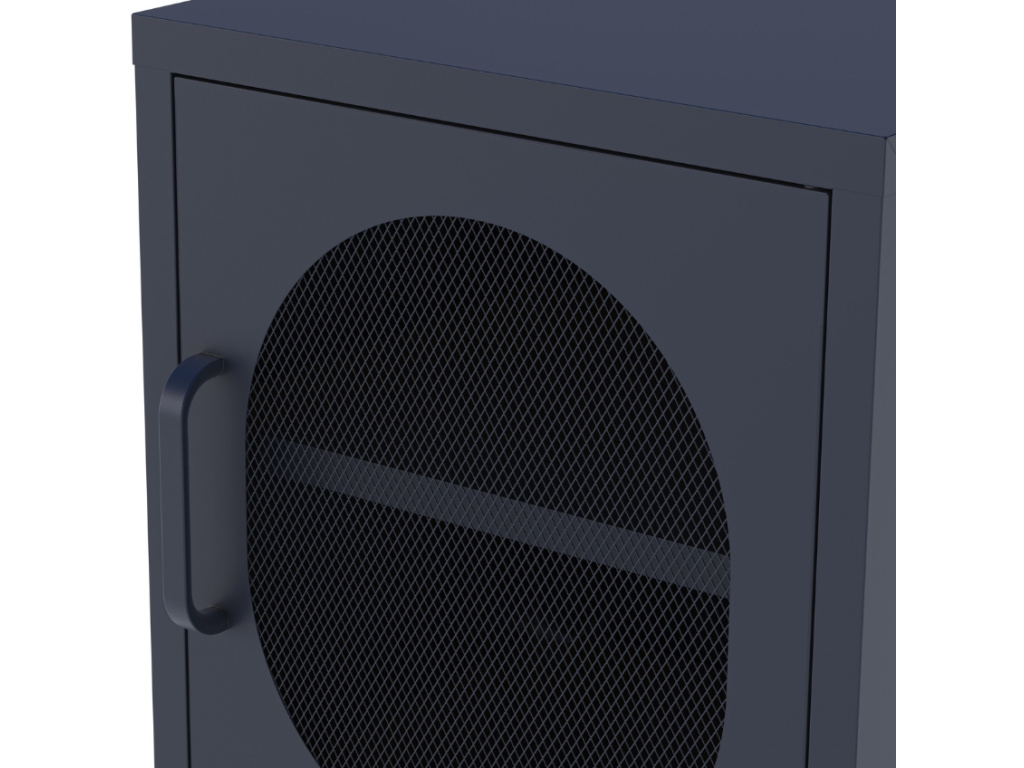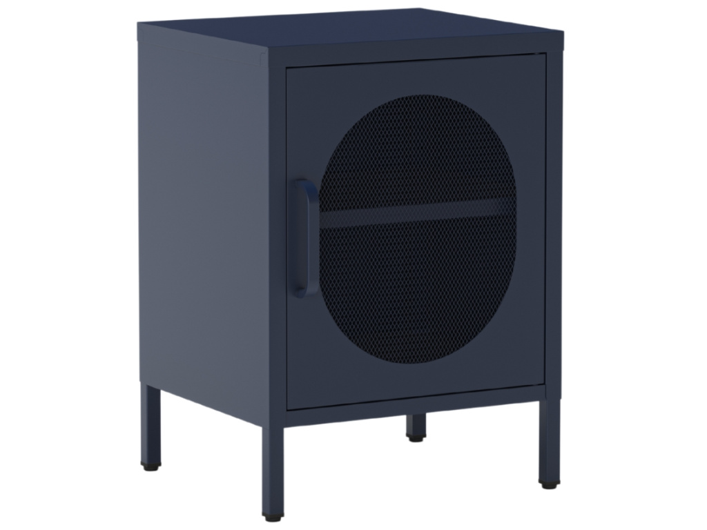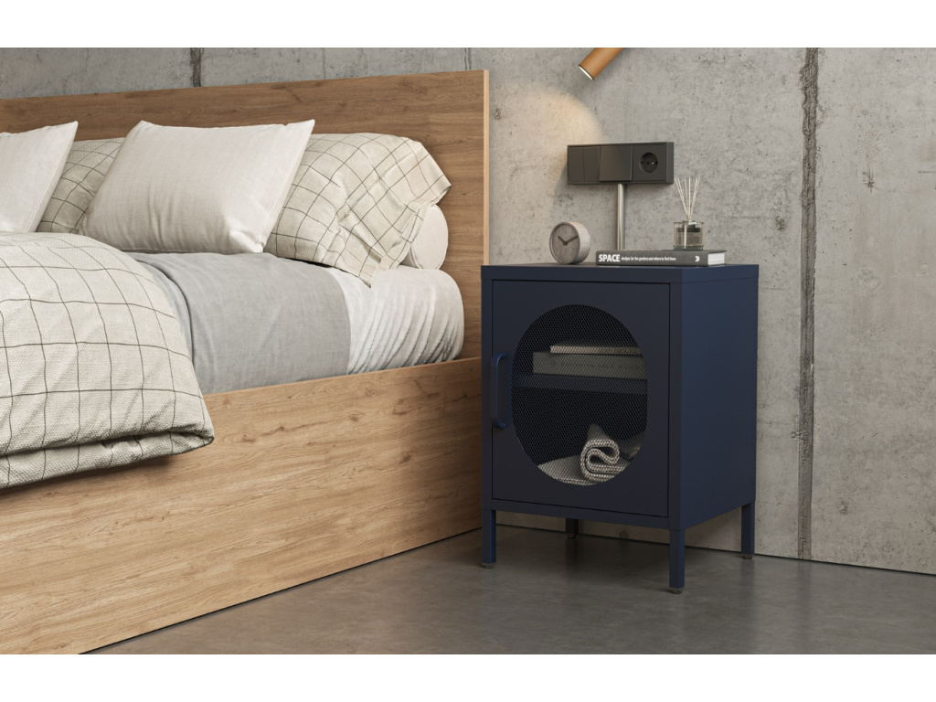 Kovový noční stolek Diora v tmavě modrém provedení vnese do vaší ložnice osobitý šmrnc. Perforovaná dvířka s oblým dekorem odhalují úložný prostor se dvěma praktickými policemi. Nábytek perfektně zapadne do industriálních, eklektických nebo minimalistických interiérů. Ve stejnojmenné kolekci najdete také TV stolky a komody v pěti barevných variantách.
