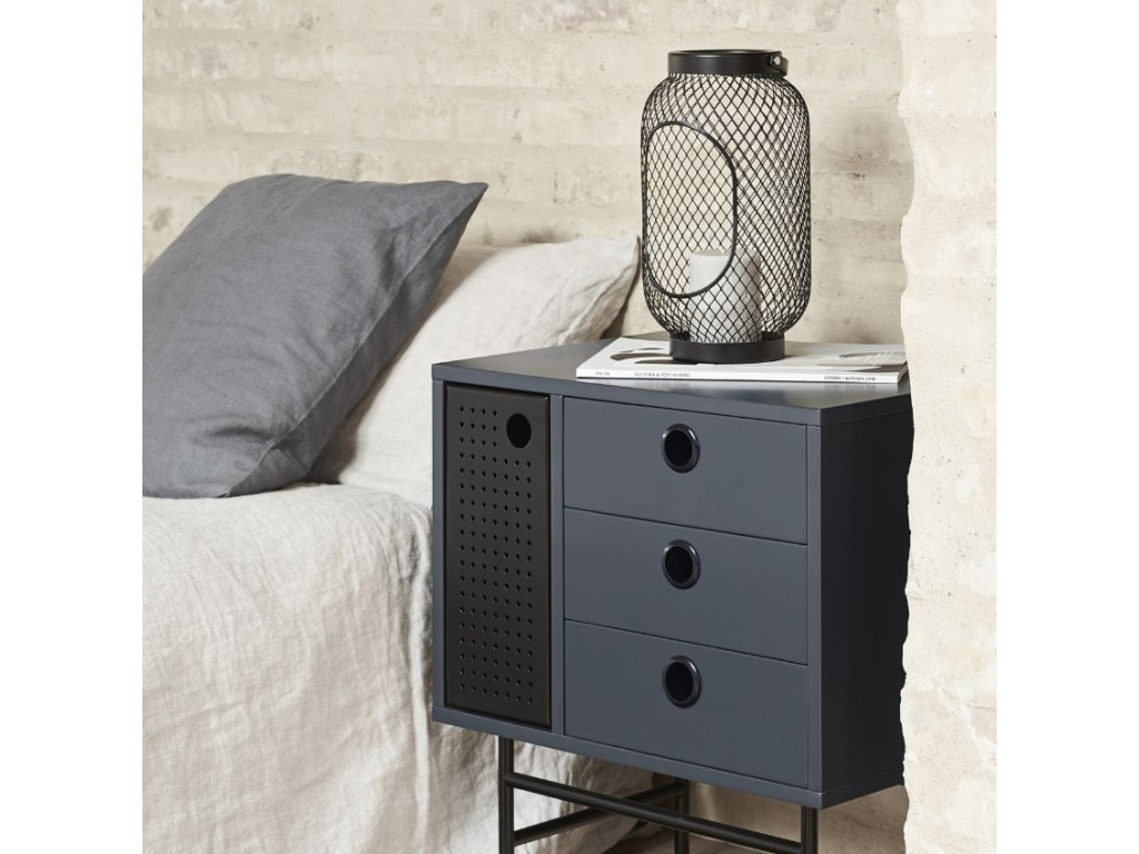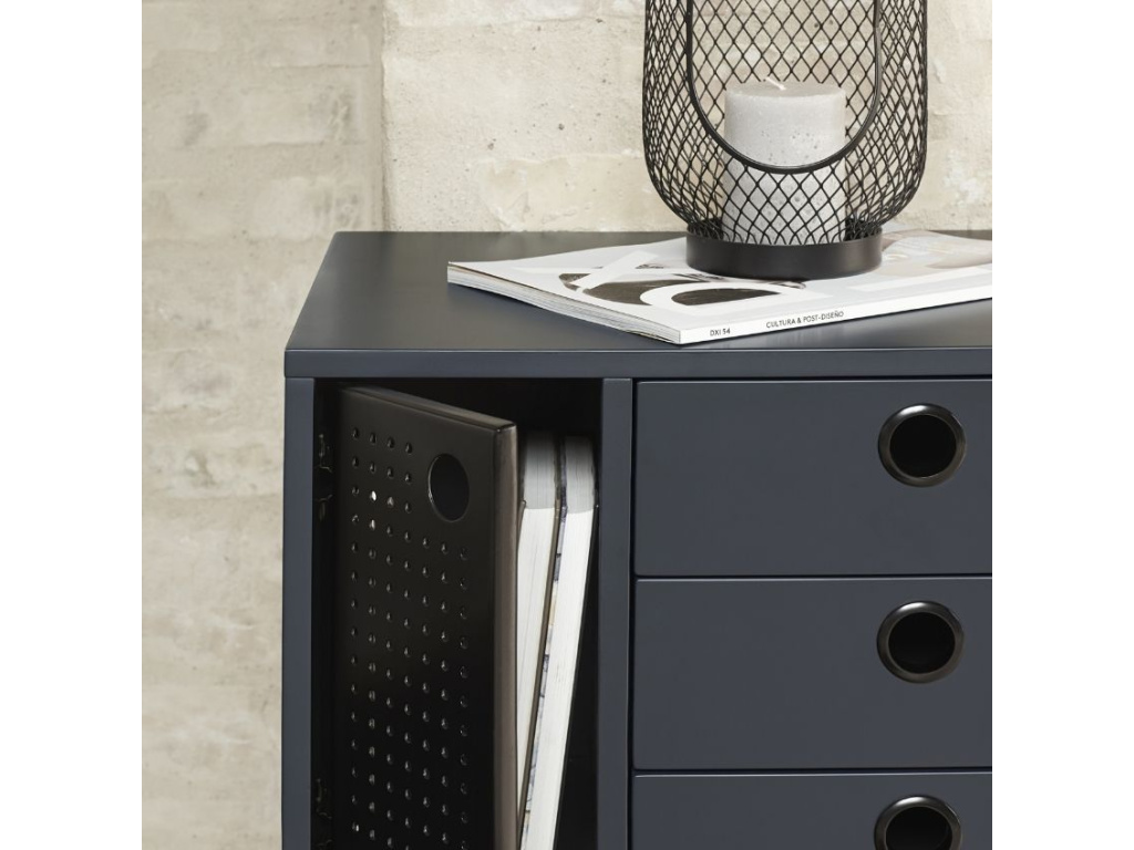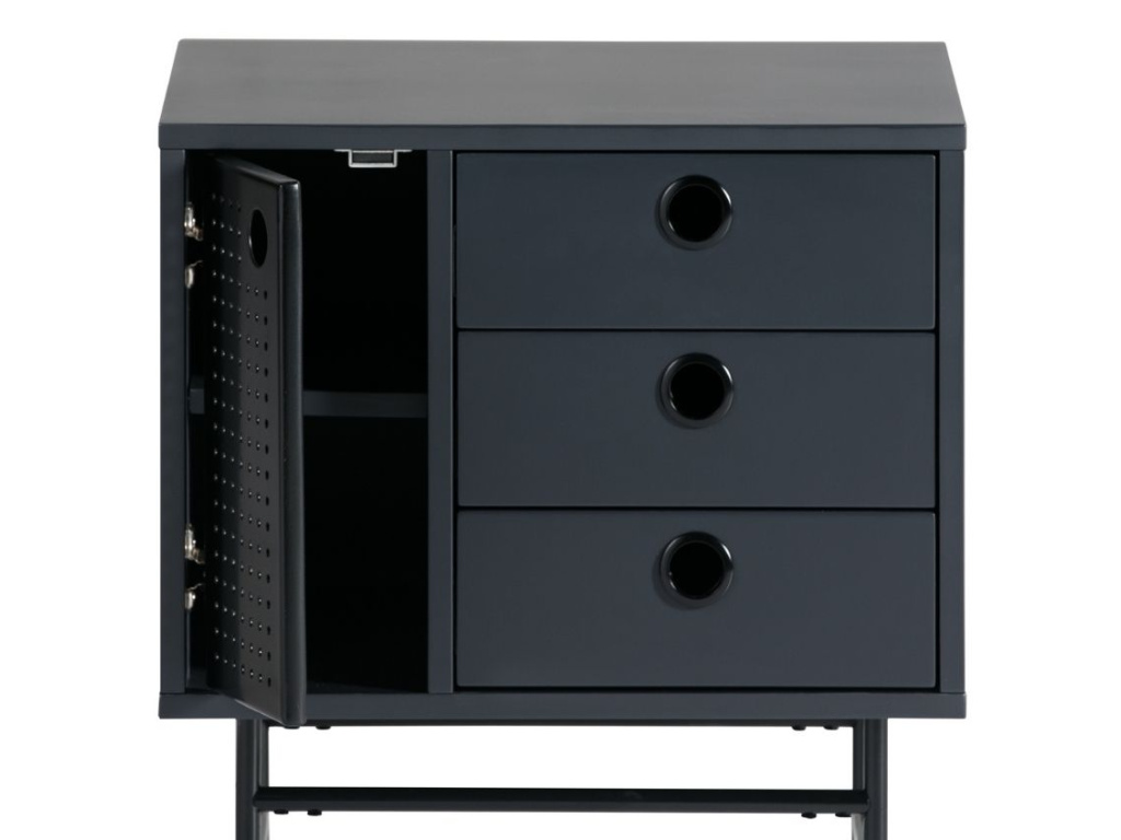 Tmavě modrý noční stolek Teulat Punto zaujme kombinací materiálů a designem s lehkým nádechem industriálního stylu, díky kterému krásně vynikne v každé moderně zařízené ložnici. Korpus stolku je z MDF se zajímavým designovým prvkem v podobě děrovaných bílých kovových dvířek a úchytů pro snadnější vysouvání zásuvek. Celek doplňuje tenká a elegantní kovová podnož v černé barvě. Praktickou výhodou stolku je netradičně velký úložný prostor jenž je rozdělen do výsuvných zásuvek a police za uzavíratelnými dvířky.