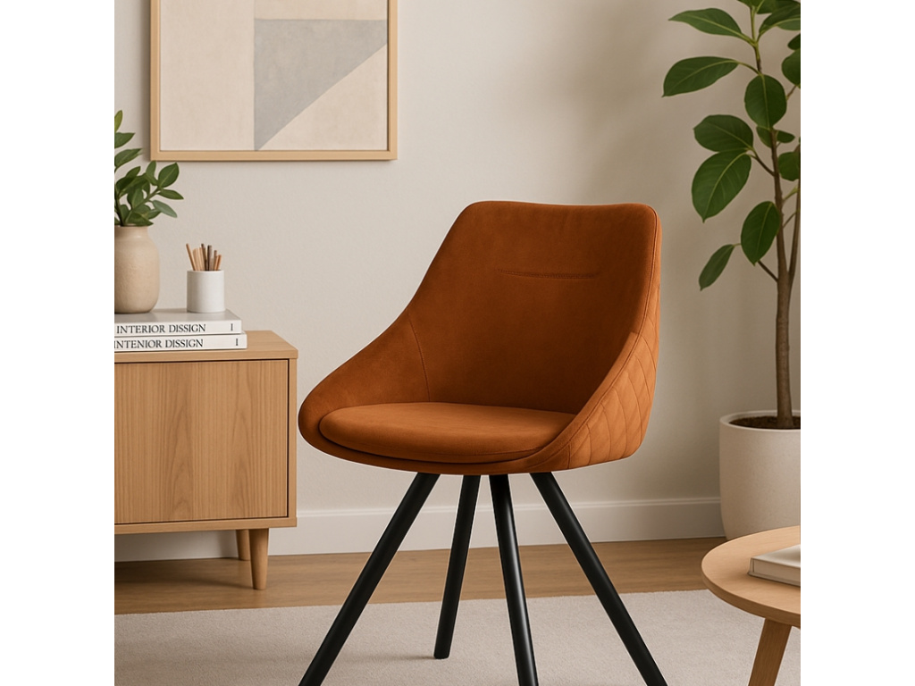 Elegantní jídelní židli Tenzo Ritz si oblíbíte pro její zaoblené tvary, kvalitní materiály a nadčasový vzhled. Sedák má čalounění ze sametové látky v tmavě oranžové barvě, které je na vnější straně prošité, což židli propůjčuje její osobitý vzhled. Celek doplňuje stabilní černě lakovaná kovová podnož. Ritz si zamilujete i pro její komfortní a pohodlný design, díky kterému promění každé jídlo nebo sezení v příjemnou chvilku relaxace a pohody.