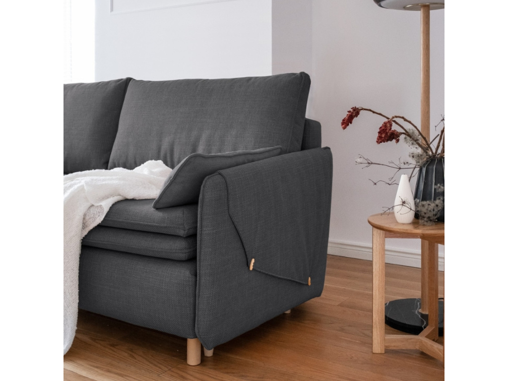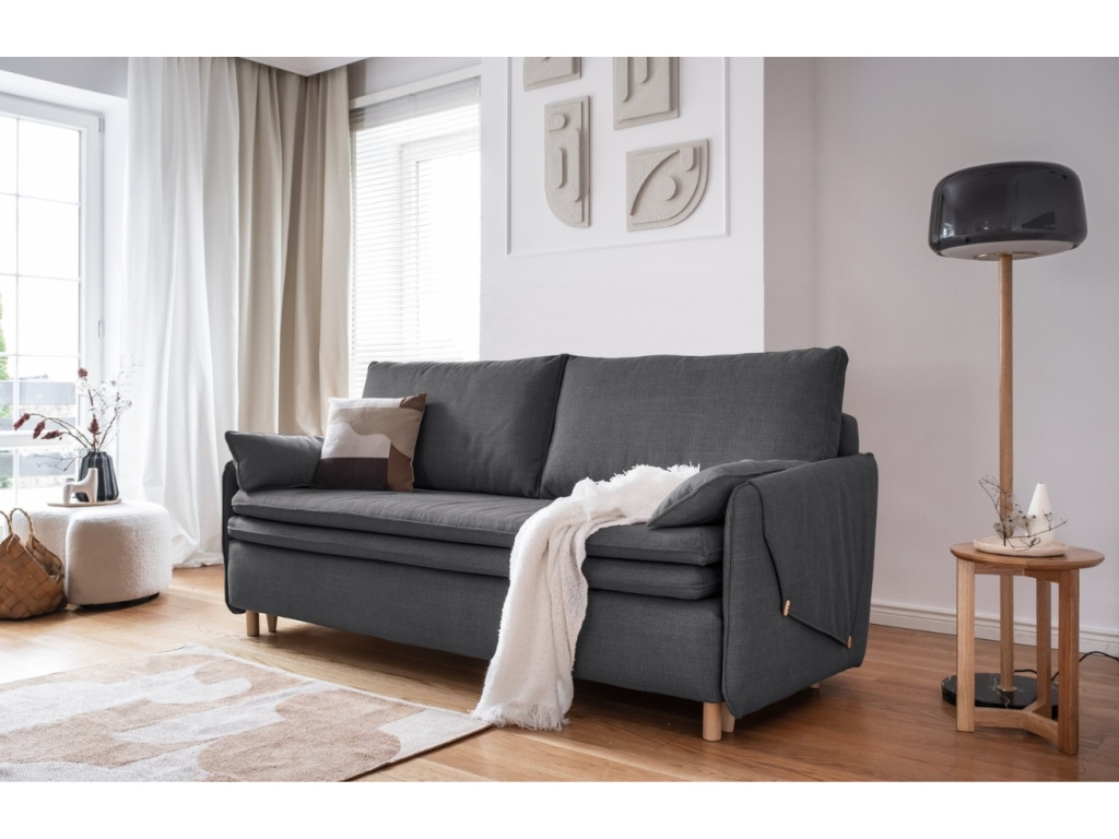 Rozkládací pohovka Simon od značky Miuform představuje ideální řešení do méně prostorných bytů. Pohovka je čalouněna příjemnou látkou, kterou po stranách zdobí dřevěné knoflíky. Zajímavostí této pohovky jsou úzké područky a vyšší dřevěná podnož, díky kterým působí lehkým a vzdušným dojmem. Pohodlný sedák snadno rozložíte na dvě matrace a rázem tak získáte místo na spaní o rozloze 140 x 190 cm. Pohovka nabízí také praktický úložný prostor, kam se pohodlně vejdou polštářky a deky.