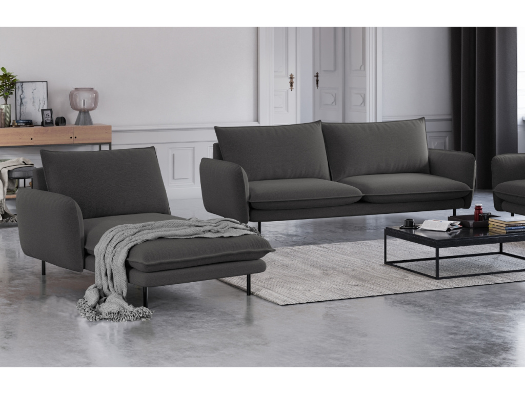 Lenoška Vienna od Cosmopolitan Design je poctou nadčasové eleganci, smyslu pro detail a dokonale vyváženým proporcím. Její jemně tvarované opěrky, měkký sedák a ladná silueta jí propůjčují vizuální lehkost, která zaujme na první pohled – a ještě více při posezení. Kontrastní černě lakovaná kovová podnož dodává celku vizuální vzdušnost a současně zajišťuje stabilitu. O vaše maximální pohodlí se postará čalounění ze strukturované látky s výraznou texturou – příjemnou na dotek, vizuálně zajímavou a zároveň mimořádně odolnou vůči každodennímu používání. Vienna vždy zapadne s lehkostí a zároveň dodá prostoru výraz. Skvěle se uplatní jako solitér pro chvíle klidu, stejně jako součást větší sedací sestavy. A právě tu můžete vytvořit s celou kolekcí Vienna, která kromě křesel nabízí také elegantní pohovky a pohodlná křesla – ideální pro ty, kteří chtějí styl i komfort dotáhnout do posledního detailu.
