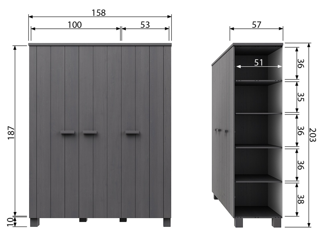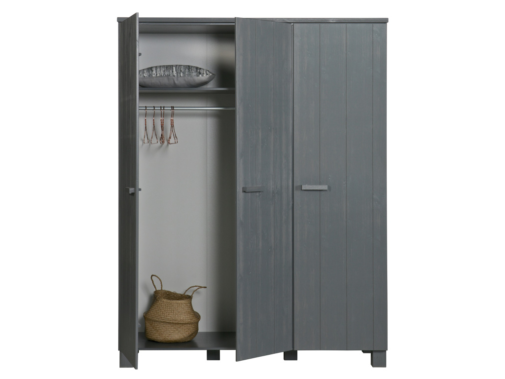 Šatní skříň Koben je vyrobena z masivního kartáčovaného borovicového dřeva lakovaného v šedém odstínu. Tato skříň klasického designu ukrývá členěný úložný prostor se čtyřmi policemi a tyčí na pověšení ramínek a nabízí tak dostatek prostoru pro uložení oblečení. Skříň Koben stylově doplní nábytek z této série a vytvoří příjemný a jednotný celek v každém interiéru.