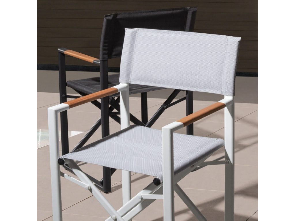 Stylová režisérská židle Taylor od italské značky Bizzotto s vámi udrží krok! Díky praktickému skládacímu mechanismu ji můžete vzít kamkoliv s sebou a užít si kvalitní posezení venku. Odolná a pevná hliníková konstrukce se speciálním práškovým nátěrem je potažena na opěradle a sedáku kvalitní látkou. Elegantním detailem je teakové dřevo na područkách, které dodává židli zajímavý vzhled. Vybírejte ze dvou základních barev – bílé a tmavě šedé.