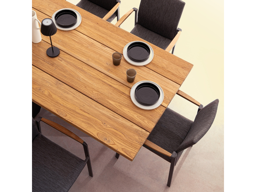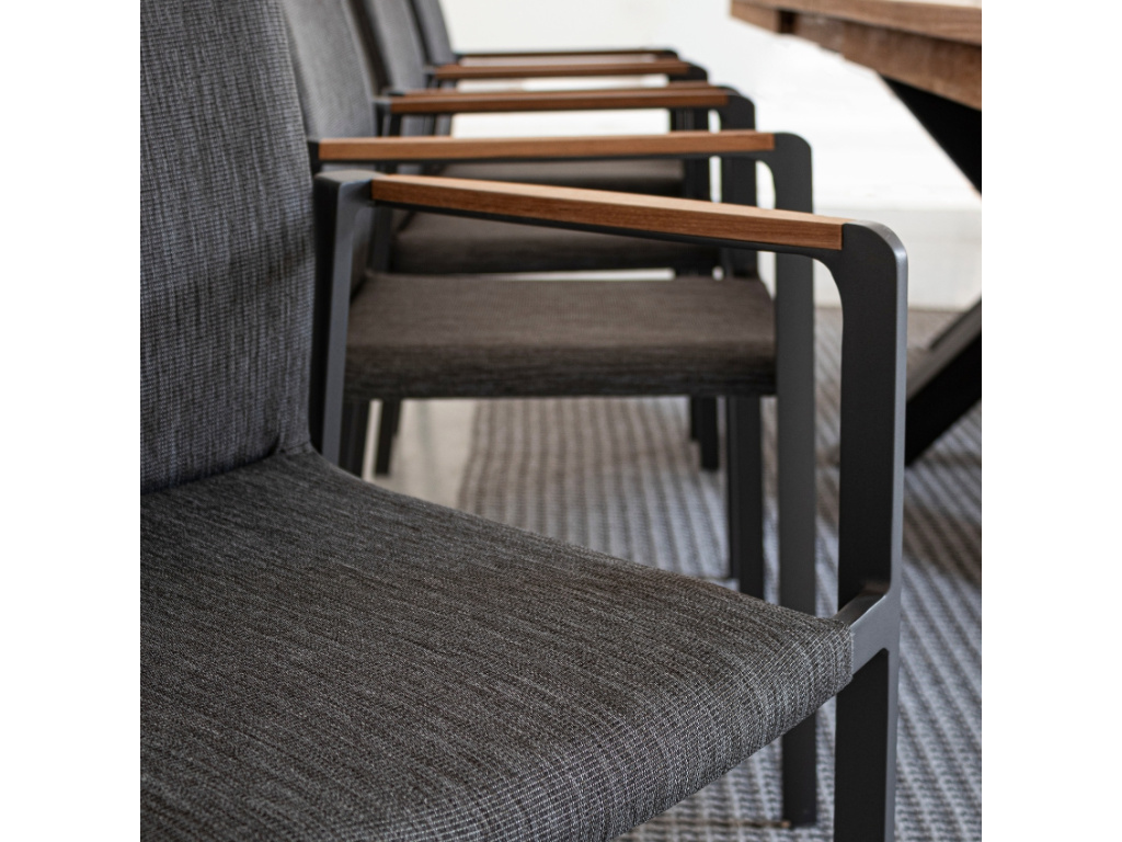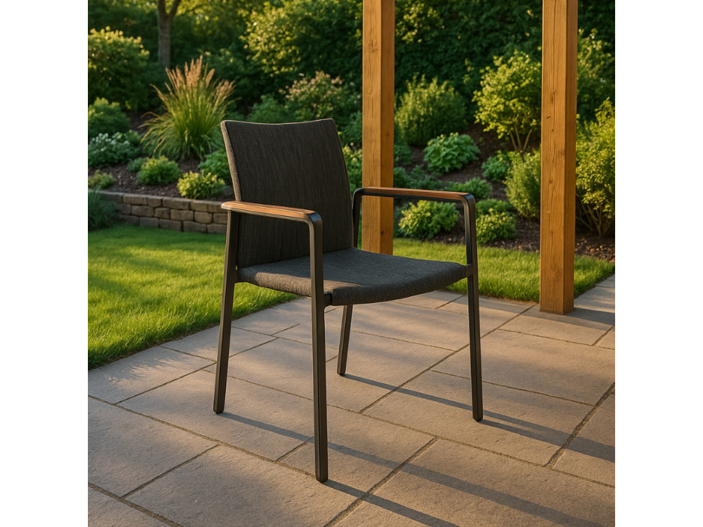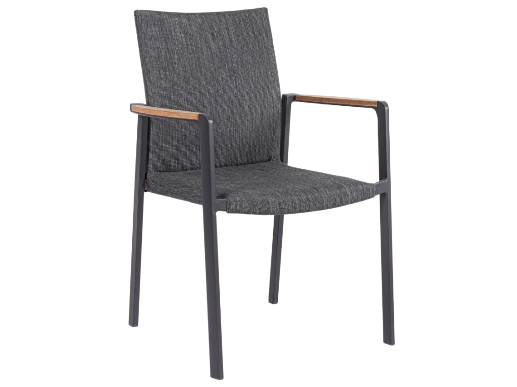 Moderní hliníková zahradní židle Jalisco od italské značky Bizzotto vás oslní elegantním designem, kvalitním zpracováním a maximálním komfortem při sezení. Pevná a stabilní konstrukce je vyrobena z práškově lakovaného hliníku v tmavě šedé barvě, který je ideální pro venkovní podmínky. Jemný detail z teakového dřeva na područkách dodává židli luxusní vzhled. Pohodlné sezení vám zajistí vkusné čalounění, které je vyrobeno ze směsi textilu a olefinu a výplně z rychleschnoucí pěny. Díky možnosti stohování židlí na sebe vám nezaberou mnoho místa, ani když je zrovna nevyužíváte. Židle nabízíme ve dvou barevných variantách.