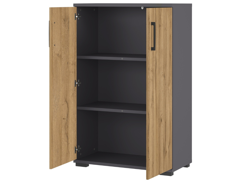 Kancelářská skříň Profi 2.0 od značky Germania spojuje moderní vzhled, precizní zpracování a dlouhou životnost – zkrátka kvalitu, na kterou se můžete spolehnout každý den. Elegantní kombinace tmavě šedého dekoru s přírodním dubem Grandson vytváří harmonický celek, který působí moderně a zároveň útulně – přesně tak, jak si představujeme ideální kancelář nebo domácí pracovnu. Povrchová úprava z melaminové pryskyřice chrání korpus před poškrábáním a vlhkostí, zatímco kvalitní ABS hrany zaručují, že si skříň zachová svůj vzhled po dlouhá léta. Za minimalistickým designem se skrývá promyšleně uspořádaný úložný prostor, který nabízí dostatek místa pro šanony, dokumenty i kancelářské doplňky. Díky několika barevným variantám si můžete zvolit provedení, které nejlépe vystihne atmosféru vašeho pracovního prostoru. Profi 2.0 tak spojuje praktičnost s elegancí a vytváří prostředí, ve kterém se snadno pracuje i dýchá.