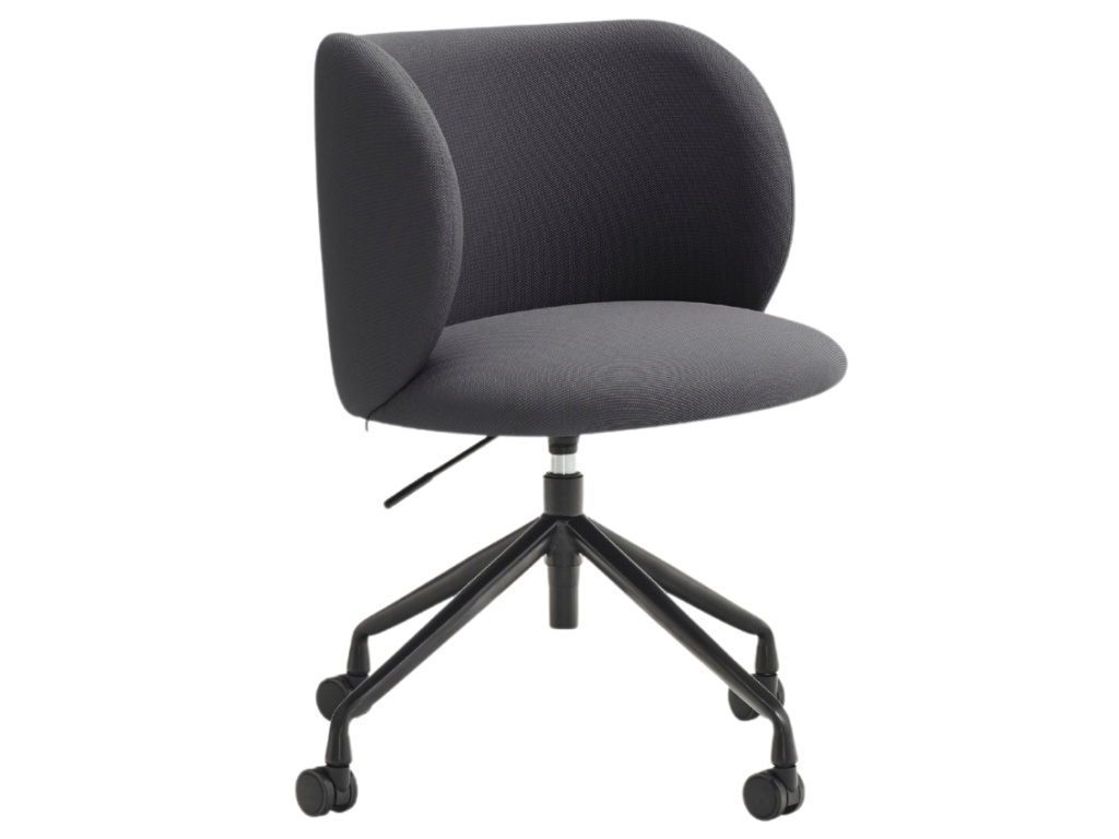 Hledáte designovou kancelářskou židli, která působí elegantně a luxusně? Čalouněná konferenční židle Mogi od španělské značky Teulat je skvělou volbou do salonů krásy nebo designových kanceláří. Otočná tmavě šedá židle na kolečkách s pohodlným širokým sedákem poskytne vám či vašim hostům maximální komfort. Zaoblená měkká opěrka vás příjemně obejme a poskytne pohodlnou oporu zad i při delším sezením. Vkusné čalounění kvalitní polyesterovou, recyklovanou látkou je doplněno kontrastní černě lakovanou, kovovou podnoží se čtyřmi rameny zakončenými kolečky. Pod sedákem najdete praktickou páku, se kterou snadno nastavíte výšku židle. Oceníte jistě také certifikaci a evropskou normu nehořlavosti (EN 1021 1&2).