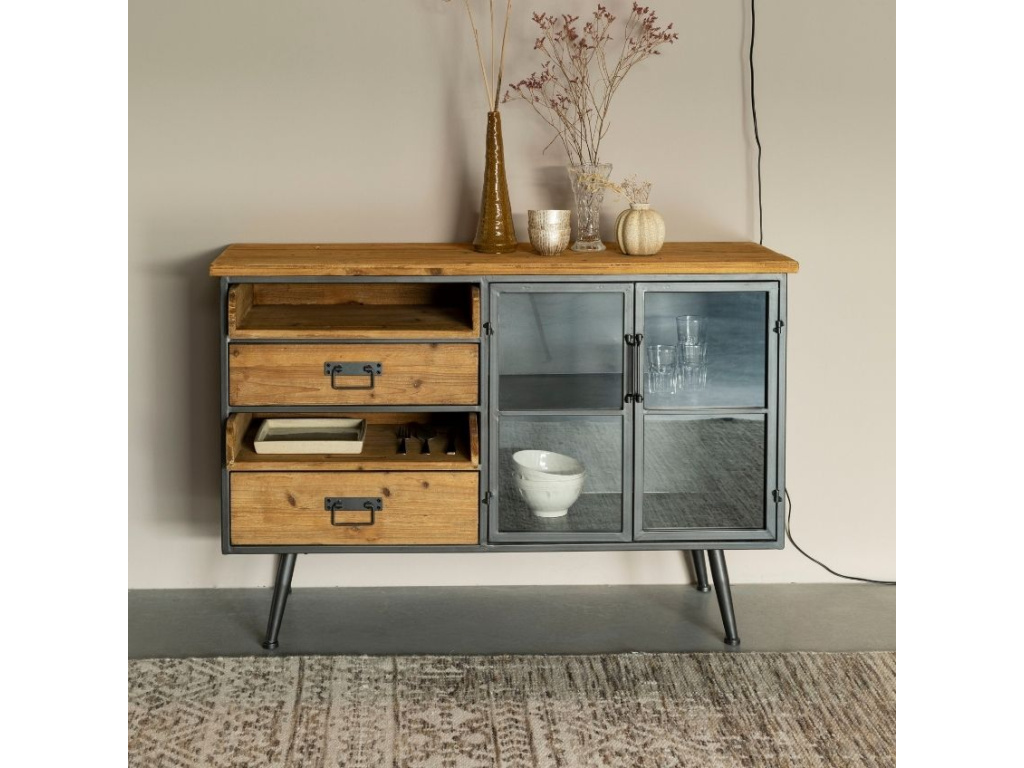 Designově velmi líbivá a hlavně praktická komoda WLL Damian s kovovou konstrukcí. Šuplíky a vrchní deska jsou vyrobeny z jedlového dřeva v kombinaci s MDF. Tělo a rukojeti jsou ze železa, které je důmyslně potaženo šedým práškem. Pro oku lahodící pohled je vitrína vyrobena z tvrzeného skla. Tento kousek se bude skvěle vyjímat na chalupách nebo v rustikálnějších prostorech.